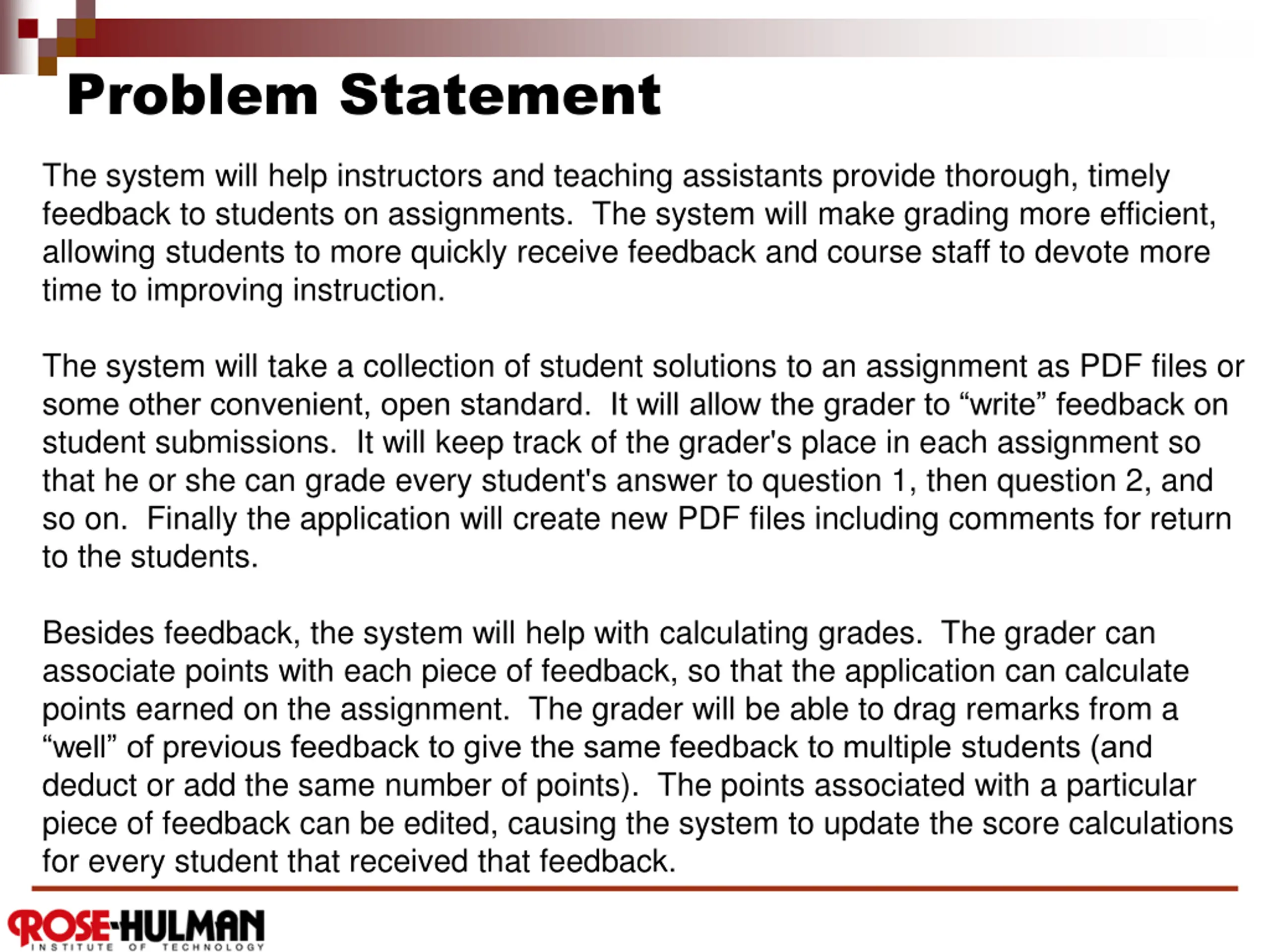 Problem Statement The system will help instructors and teaching assistants provide thorough, timely feedback to students on assignments. The system will make grading more efficient, allowing students to more quickly receive feedback and course staff to devote more time to improving instruction. The system will take a collection of student solutions to an assignment as PDF files or some other convenient, open standard. It will allow the grader to write feedback on student submissions. It will keep track of the grader's place in each assignment so that he or she can grade every student's answer to question 1, then question 2, and so on. Finally the application will create new PDF files including comments for return to the students. Besides feedback, the system will help with calculating grades. The grader can associate points with each piece of feedback, so that the application can calculate points earned on the assignment. The grader will be able to drag remarks from a well of previous feedback to give the same feedback to multiple students (and deduct or add the same number of points). The points associated with a particular piece of feedback can be edited, causing the system to update the score calculations for every student that received that feedback.