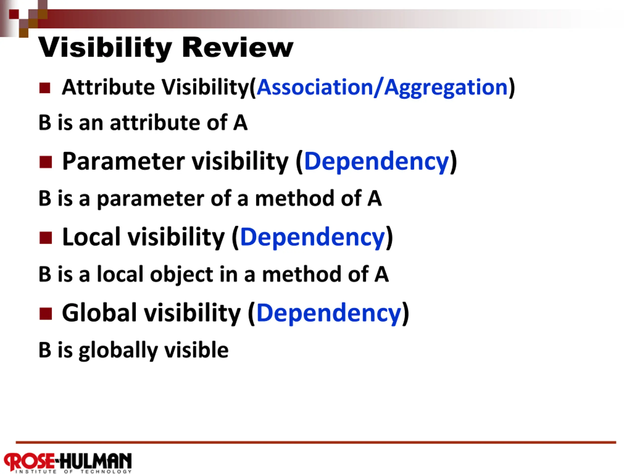Visibility Review Attribute Visibility(Association/Aggregation) B is an attribute of A Parameter visibility (Dependency) B is a parameter of a method of A Local visibility (Dependency) B is a local object in a method of A Global visibility (Dependency) B is globally visible