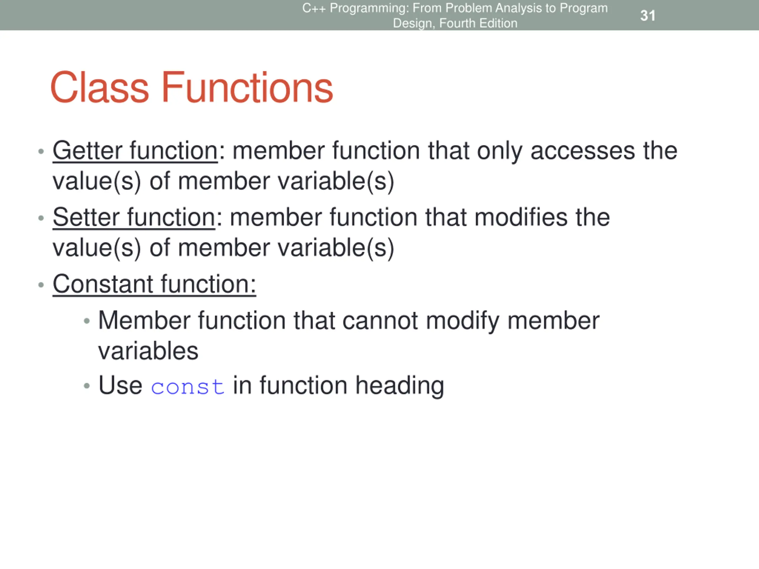 C++ Programming: From Problem Analysis to Program Design, Fourth Edition 30 Example These functions cannot modify the member variables of a variable of type clockType const: formal parameter can t modify the value of the actual parameter private members, can t be accessed from outside the class