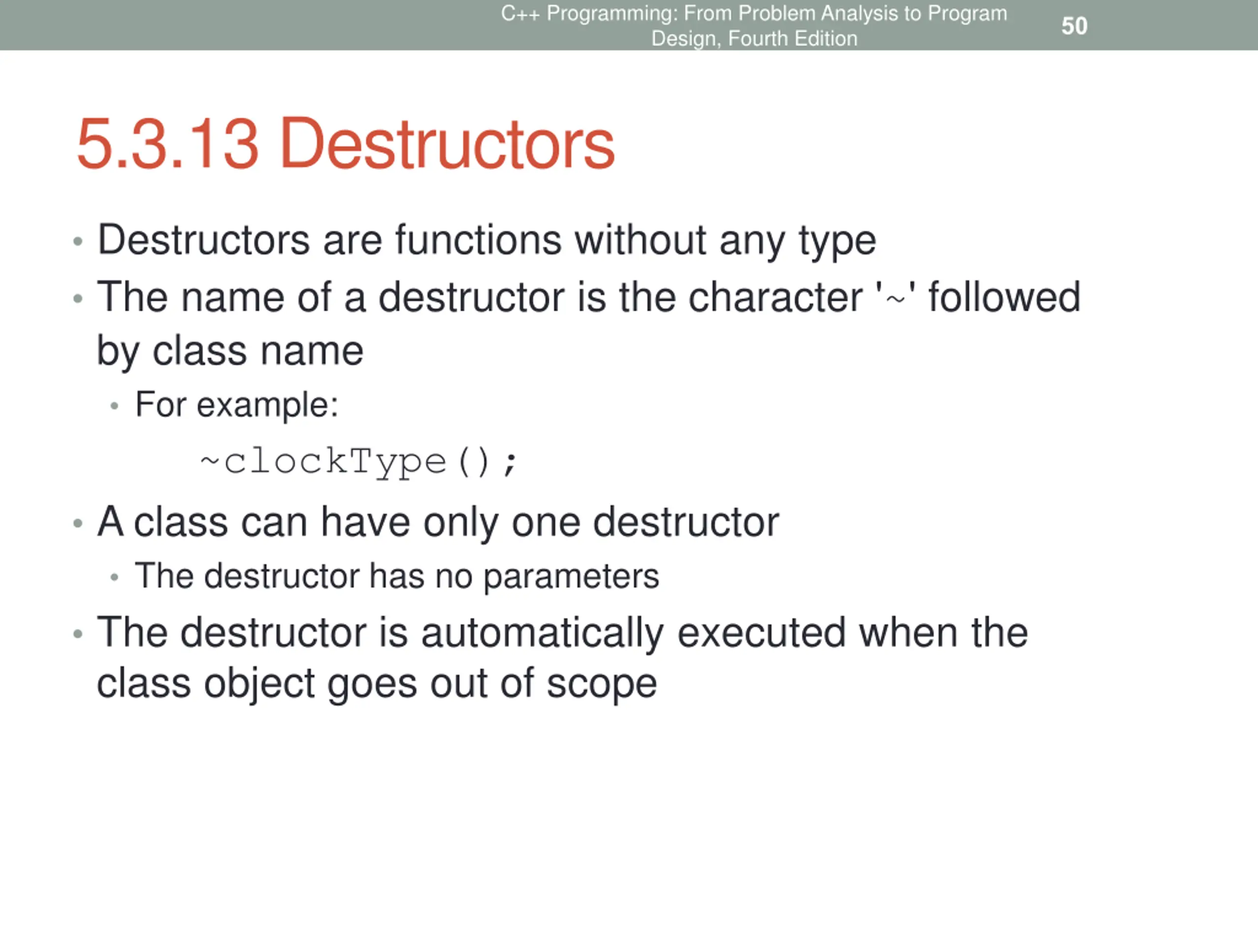 C++ Programming: From Problem Analysis to Program Design, Fourth Edition 50 5.3.13 Destructors Destructors are functions without any type The name of a destructor is the character '~' followed by class name For example: ~clockType(); A class can have only one destructor The destructor has no parameters The destructor is automatically executed when the class object goes out of scope