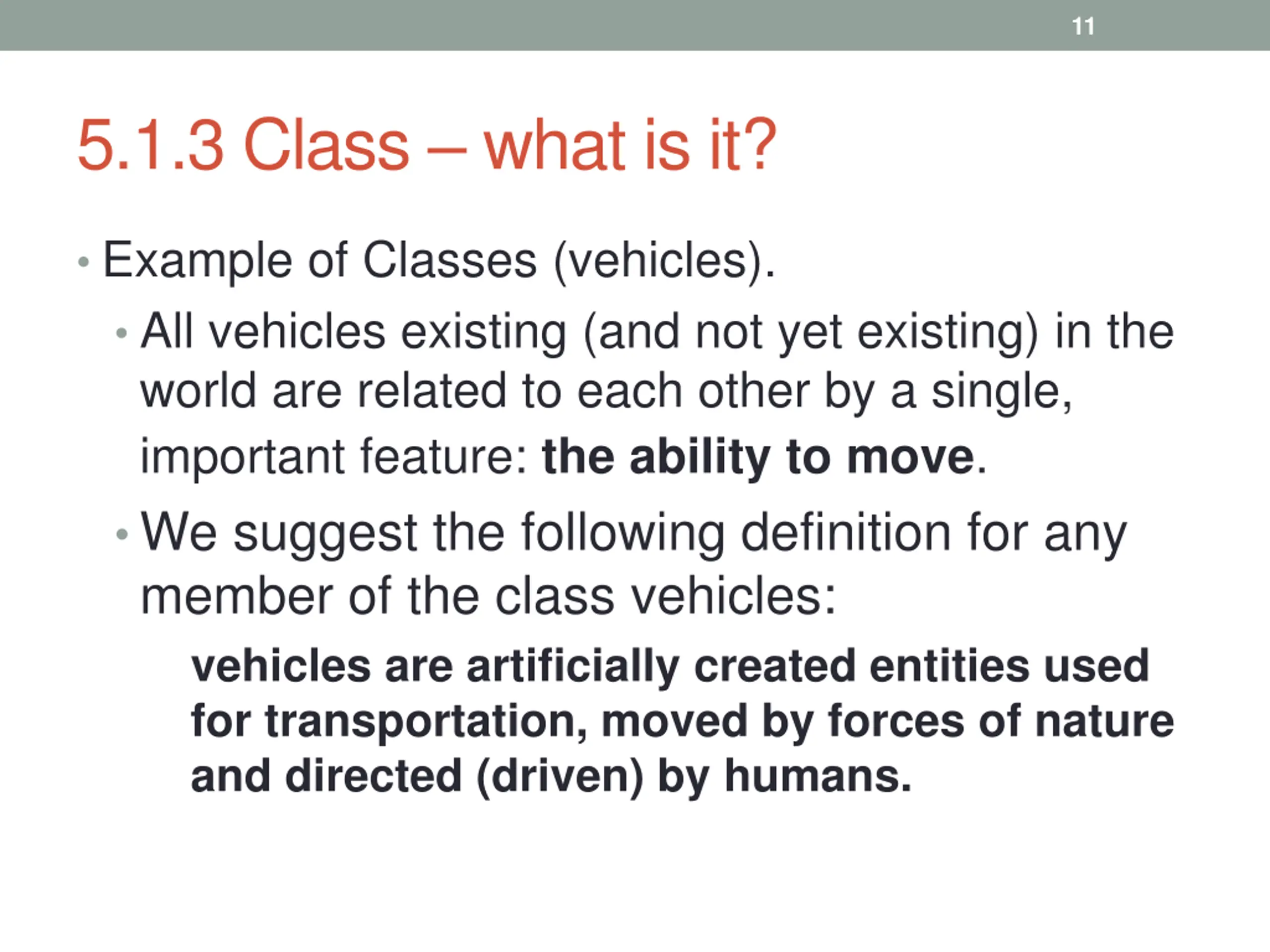 11 5.1.3 Class what is it? Example of Classes (vehicles). All vehicles existing (and not yet existing) in the world are related to each other by a single, important feature: the ability to move. We suggest the following definition for any member of the class vehicles: vehicles are artificially created entities used for transportation, moved by forces of nature and directed (driven) by humans.
