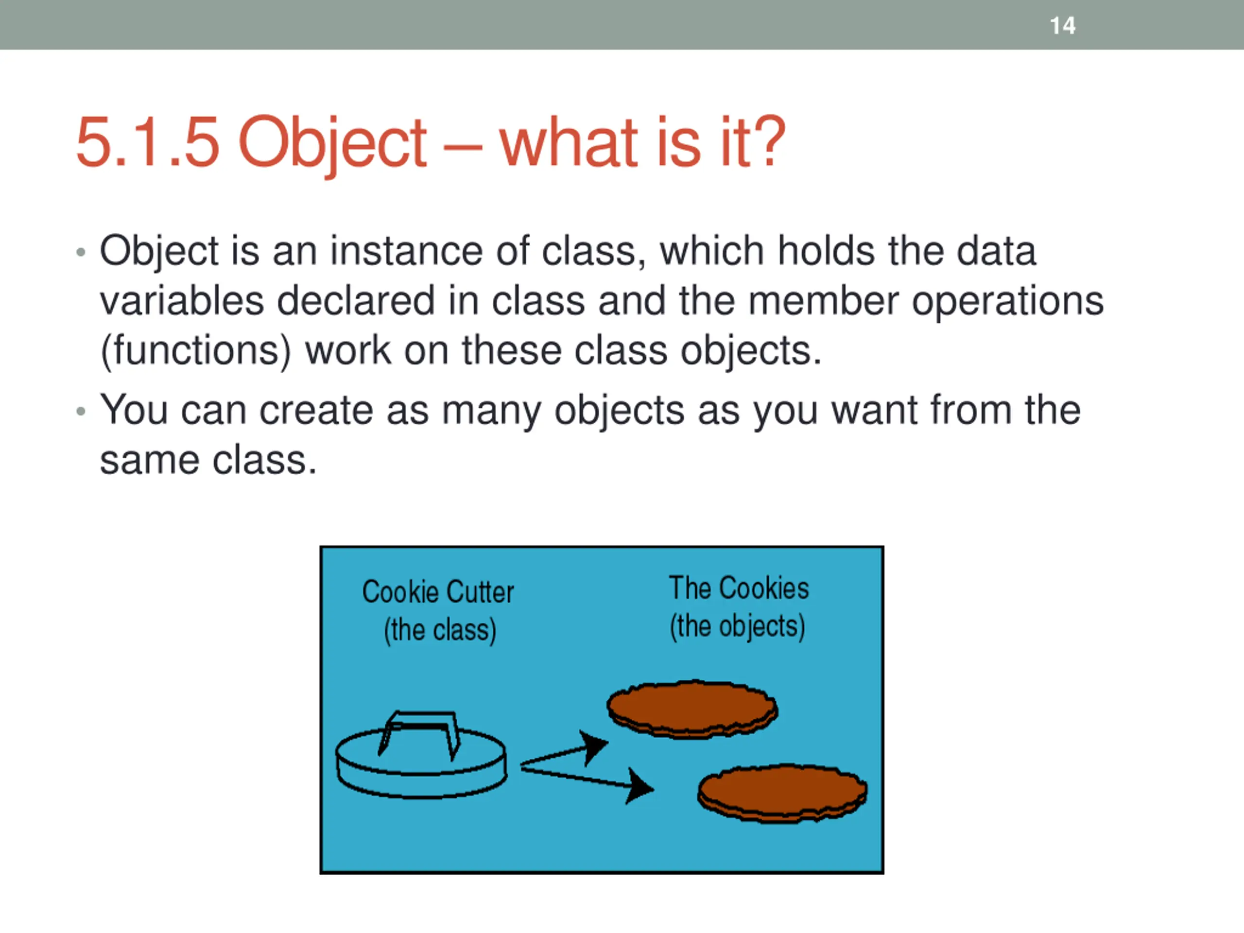 14 5.1.5 Object what is it? Object is an instance of class, which holds the data variables declared in class and the member operations (functions) work on these class objects. You can create as many objects as you want from the same class.