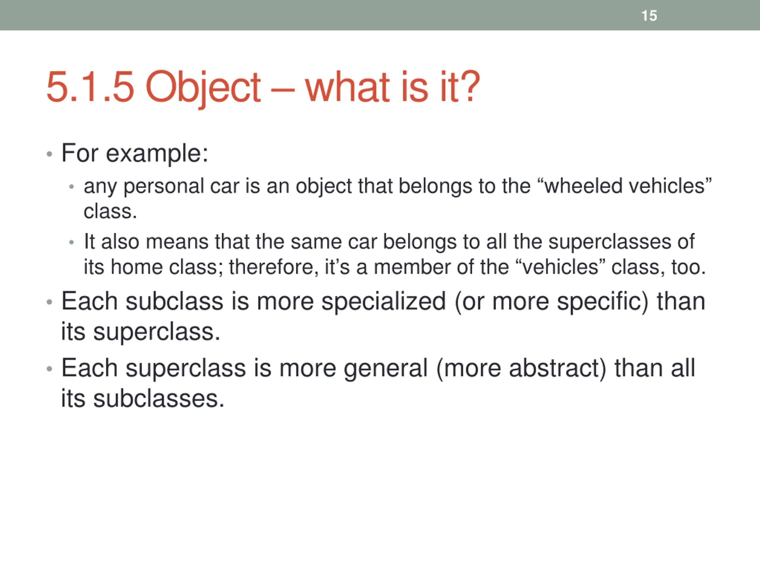 15 5.1.5 Object what is it? For example: any personal car is an object that belongs to the wheeled vehicles class. It also means that the same car belongs to all the superclasses of its home class; therefore, it s a member of the vehicles class, too. Each subclass is more specialized (or more specific) than its superclass. Each superclass is more general (more abstract) than all its subclasses.