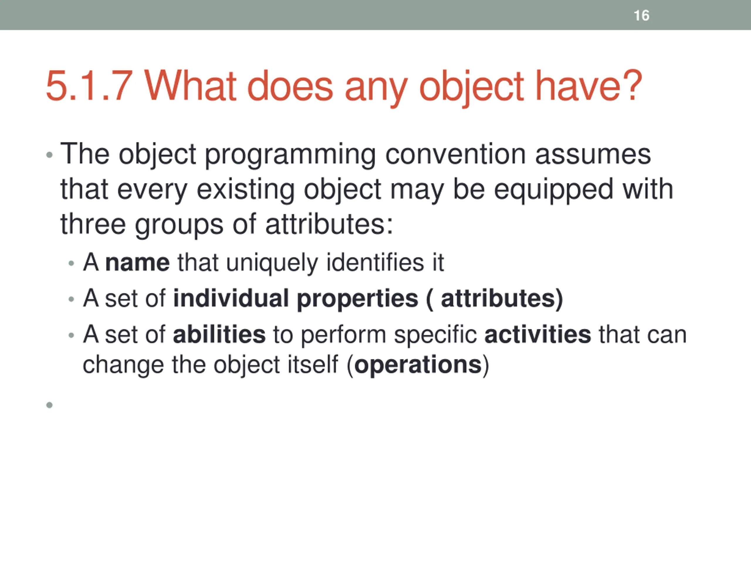 16 5.1.7 What does any object have? The object programming convention assumes that every existing object may be equipped with three groups of attributes: A name that uniquely identifies it A set of individual properties ( attributes) A set of abilities to perform specific activities that can change the object itself (operations)
