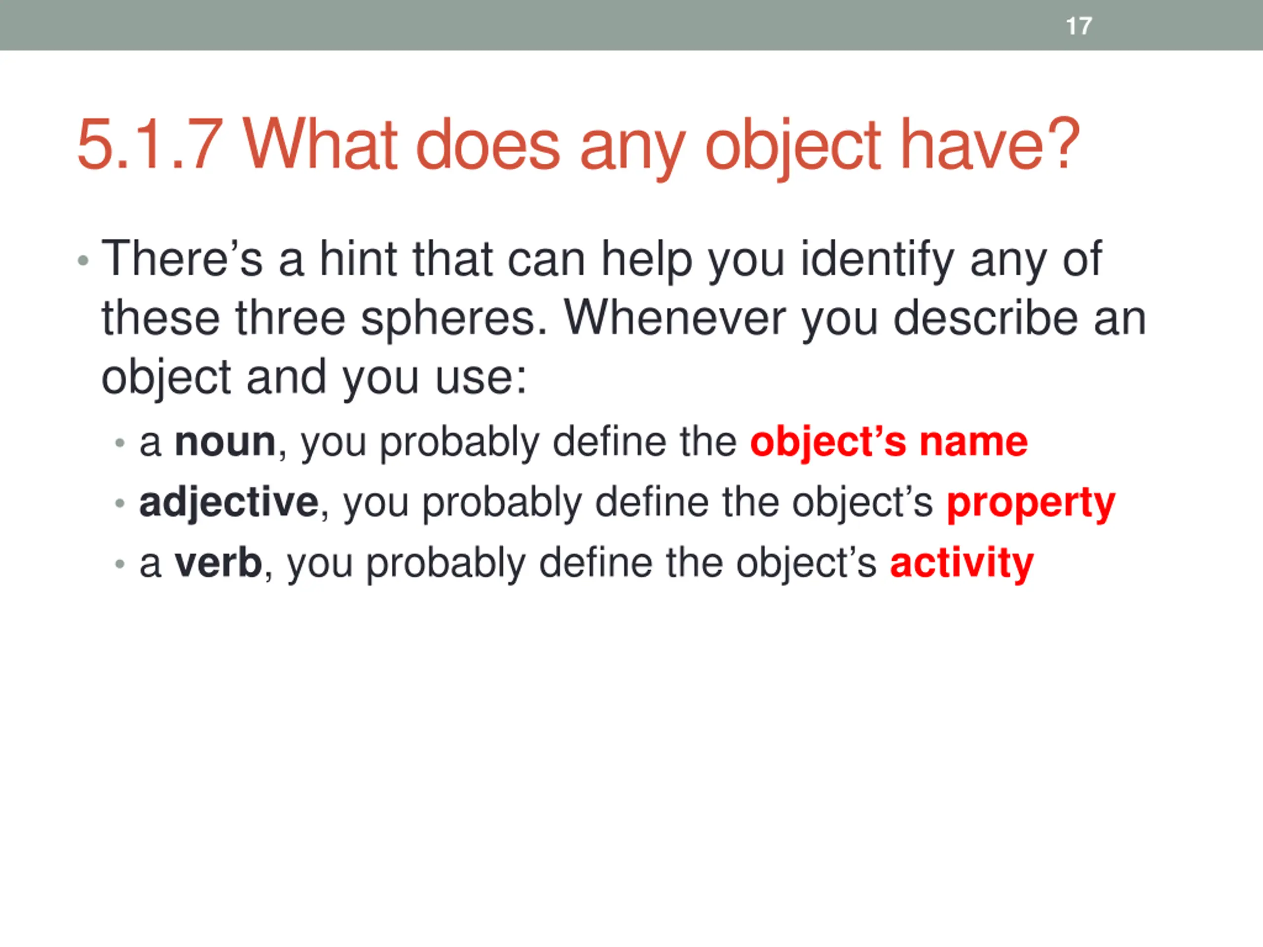 17 5.1.7 What does any object have? There s a hint that can help you identify any of these three spheres. Whenever you describe an object and you use: a noun, you probably define the object s name adjective, you probably define the object s property a verb, you probably define the object s activity
