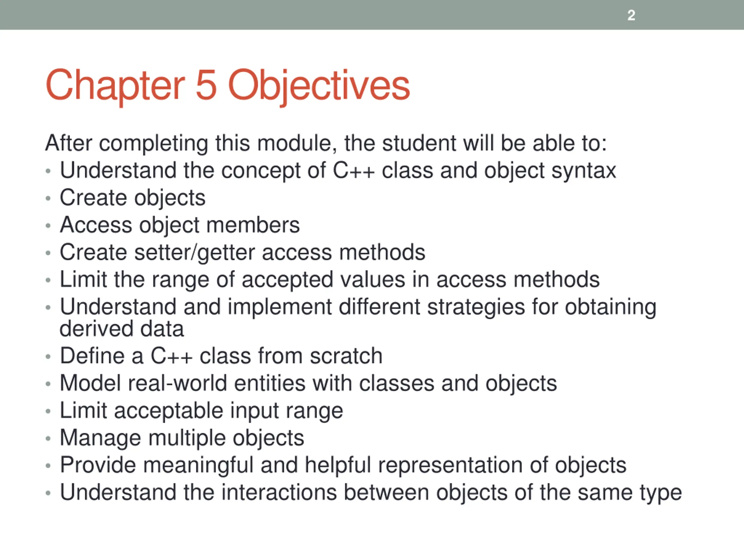 2 Chapter 5 Objectives After completing this module, the student will be able to: Understand the concept of C++ class and object syntax Create objects Access object members Create setter/getter access methods Limit the range of accepted values in access methods Understand and implement different strategies for obtaining derived data Define a C++ class from scratch Model real-world entities with classes and objects Limit acceptable input range Manage multiple objects Provide meaningful and helpful representation of objects Understand the interactions between objects of the same type