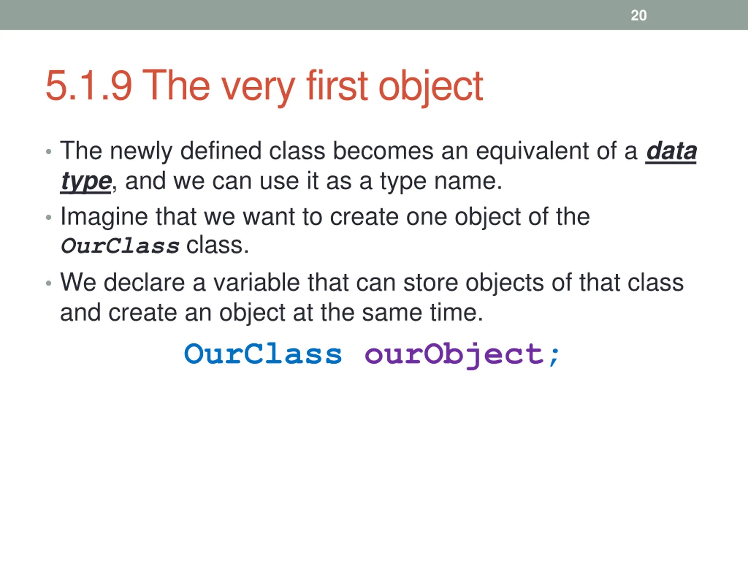 20 5.1.9 The very first object The newly defined class becomes an equivalent of a data type, and we can use it as a type name. Imagine that we want to create one object of the OurClassclass. We declare a variable that can store objects of that class and create an object at the same time. OurClass ourObject;