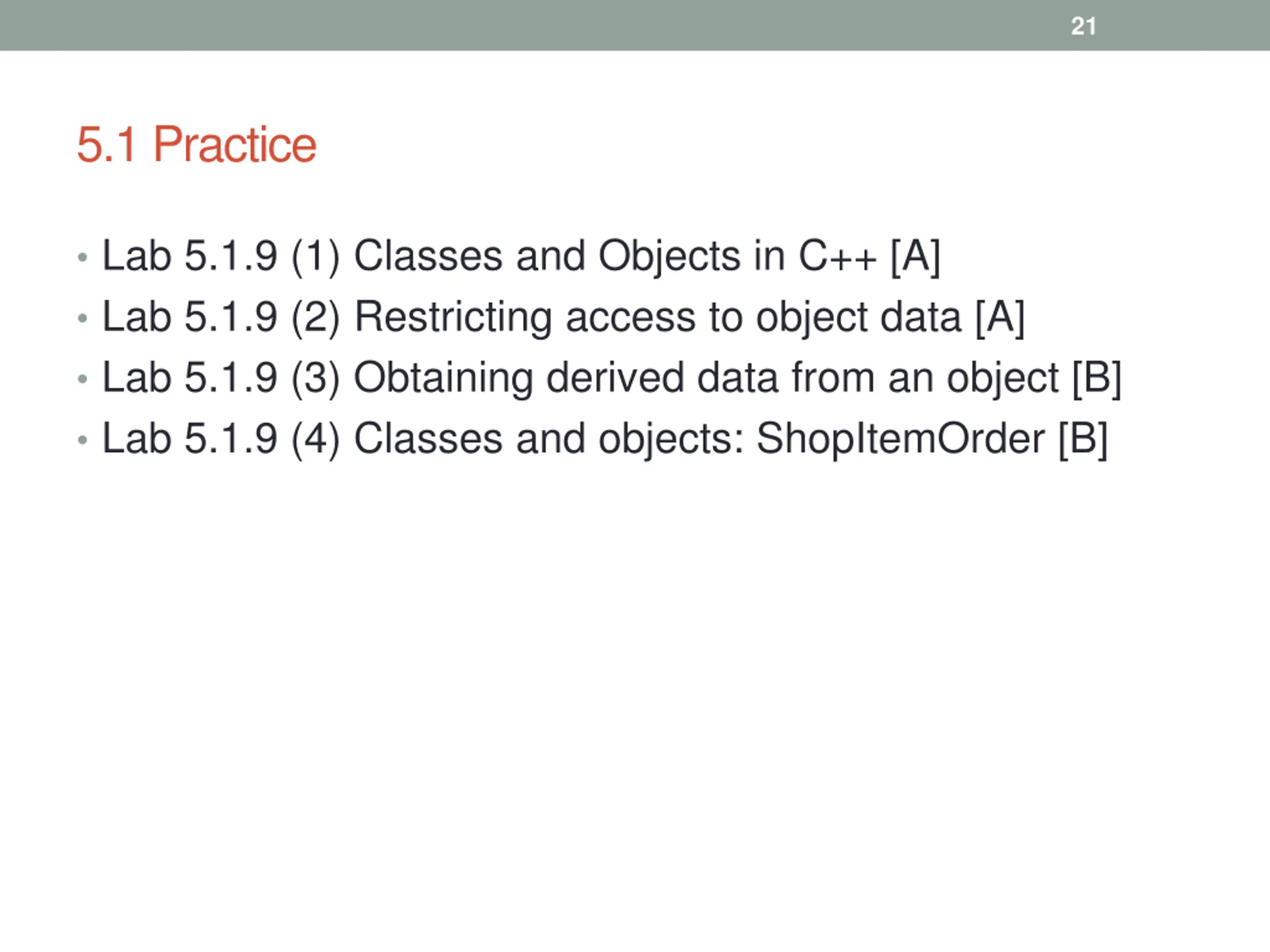 21 5.1 Practice Lab 5.1.9 (1) Classes and Objects in C++ [A] Lab 5.1.9 (2) Restricting access to object data [A] Lab 5.1.9 (3) Obtaining derived data from an object [B] Lab 5.1.9 (4) Classes and objects: ShopItemOrder [B]