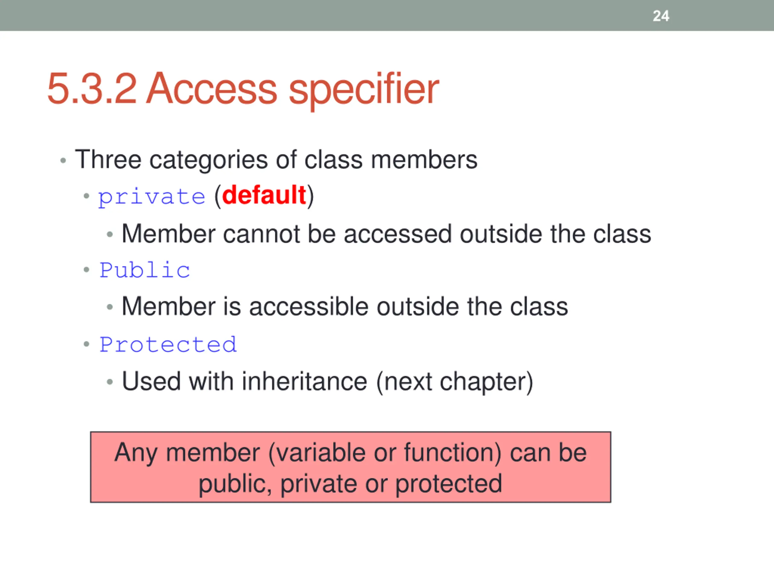 24 5.3.2 Access specifier Three categories of class members private (default) Member cannot be accessed outside the class Public Member is accessible outside the class Protected Used with inheritance (next chapter) Any member (variable or function) can be public, private or protected