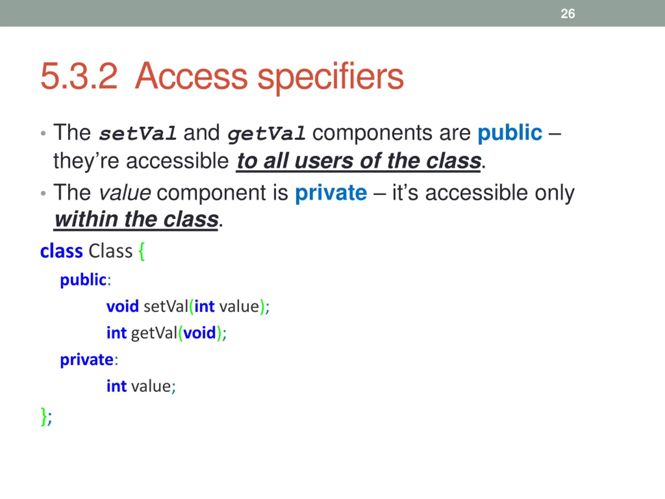 26 5.3.2 Access specifiers The setVal and getVal components are public they re accessible to all users of the class. The value component is private it s accessible only within the class. class Class { public: void setVal(int value); int getVal(void); private: int value; };