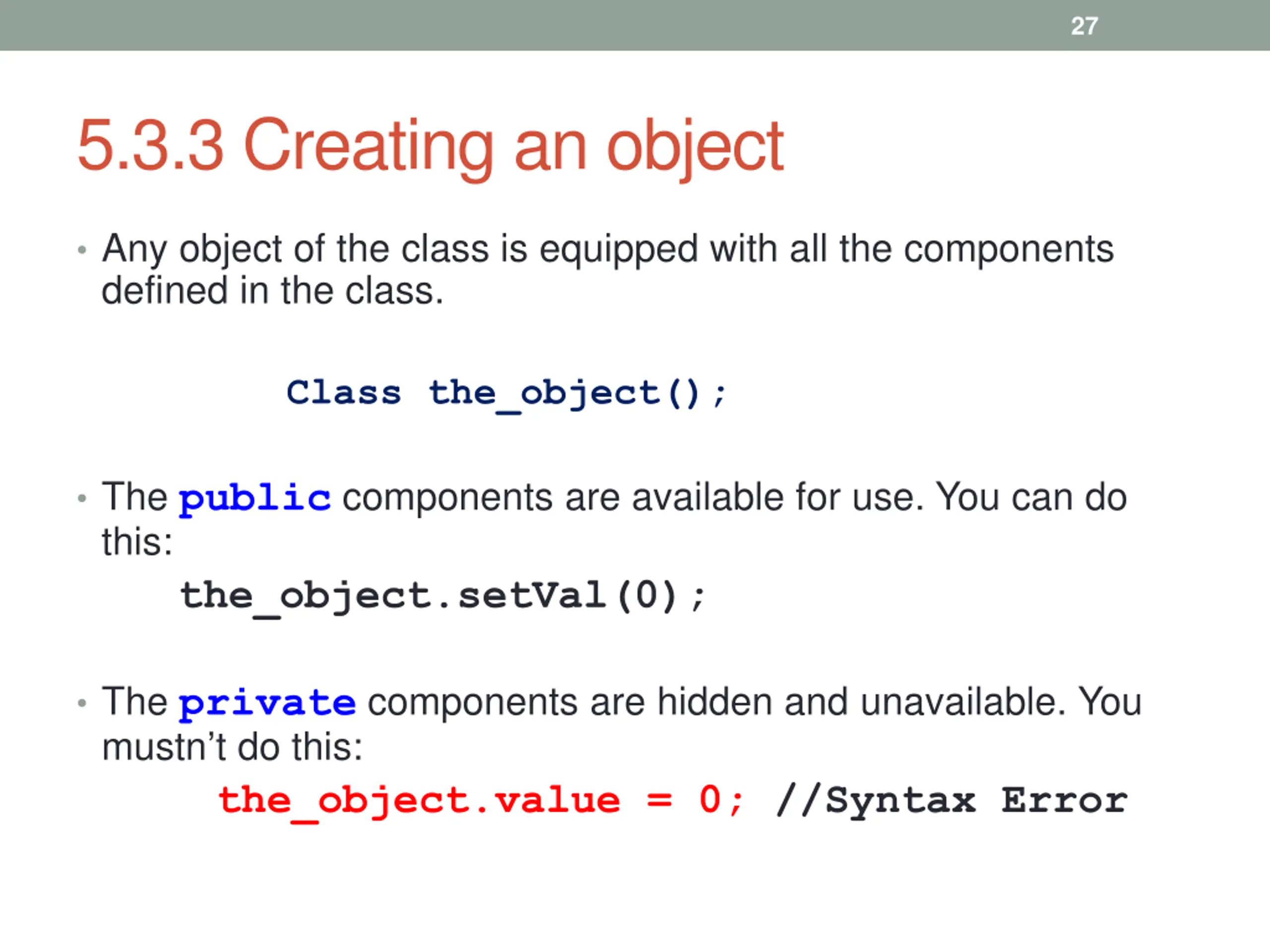 27 5.3.3 Creating an object Any object of the class is equipped with all the components defined in the class. Class the_object(); The public components are available for use. You can do this: the_object.setVal(0); The private components are hidden and unavailable. You mustn t do this: the_object.value = 0; //Syntax Error
