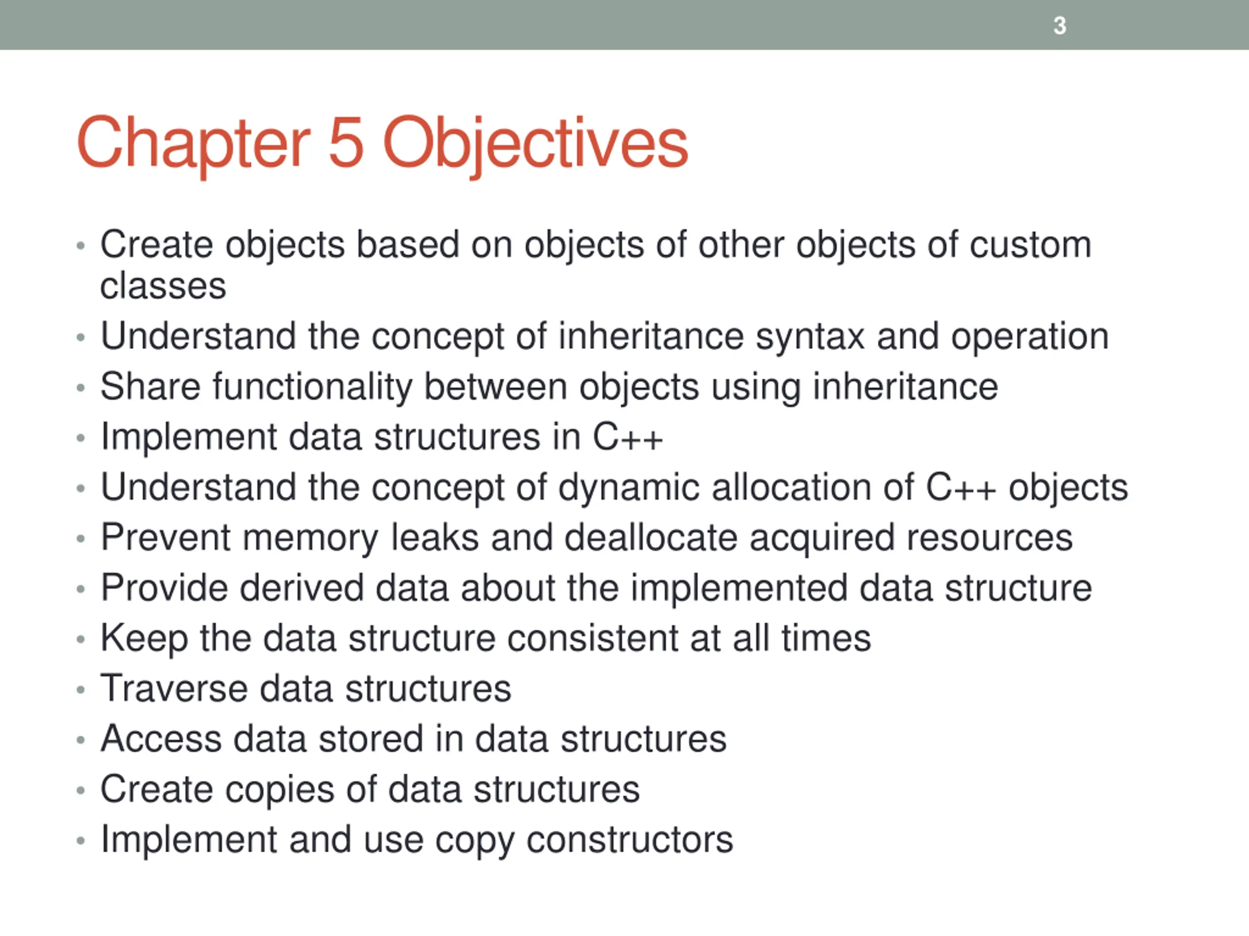 3 Chapter 5 Objectives Create objects based on objects of other objects of custom classes Understand the concept of inheritance syntax and operation Share functionality between objects using inheritance Implement data structures in C++ Understand the concept of dynamic allocation of C++ objects Prevent memory leaks and deallocate acquired resources Provide derived data about the implemented data structure Keep the data structure consistent at all times Traverse data structures Access data stored in data structures Create copies of data structures Implement and use copy constructors