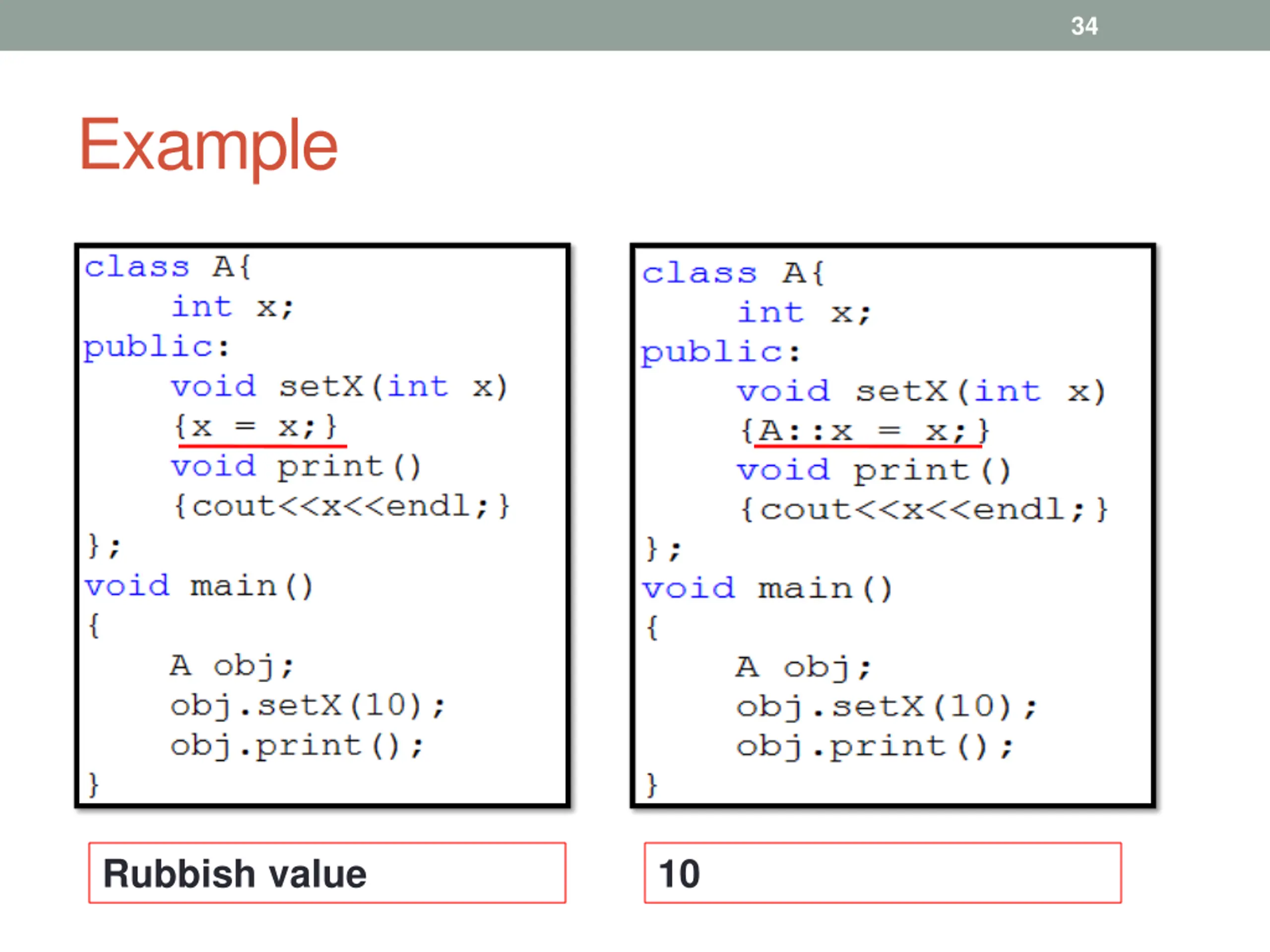 39 Example class Class { public: void setVal(int value) { this -> value = value; } void setVal(void) { value = -2; } int getVal(void) { return value; } private: int value; }; int main() { Class obj; obj.setVal(20); // call the first version of the function obj.setVal(); // call the second version of the function }