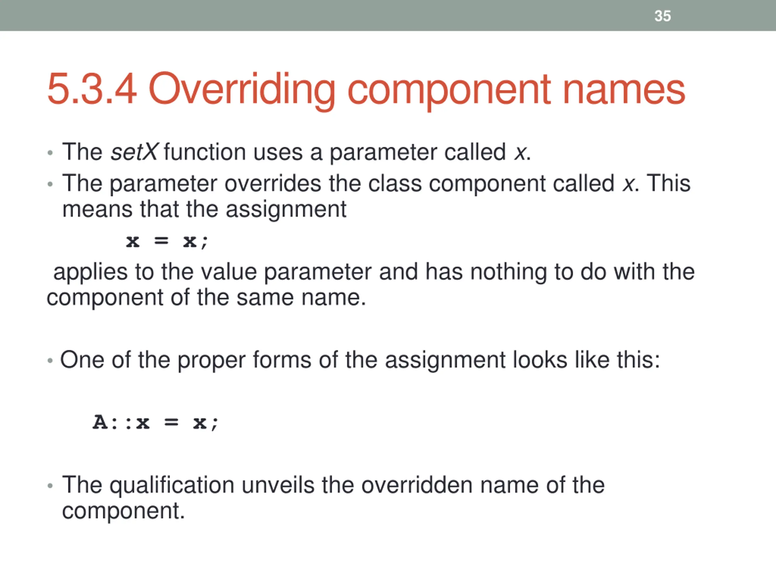 35 5.3.4 Overriding component names The setX function uses a parameter called x. The parameter overrides the class component called x. This means that the assignment x = x; applies to the value parameter and has nothing to do with the component of the same name. One of the proper forms of the assignment looks like this: A::x = x; The qualification unveils the overridden name of the component.