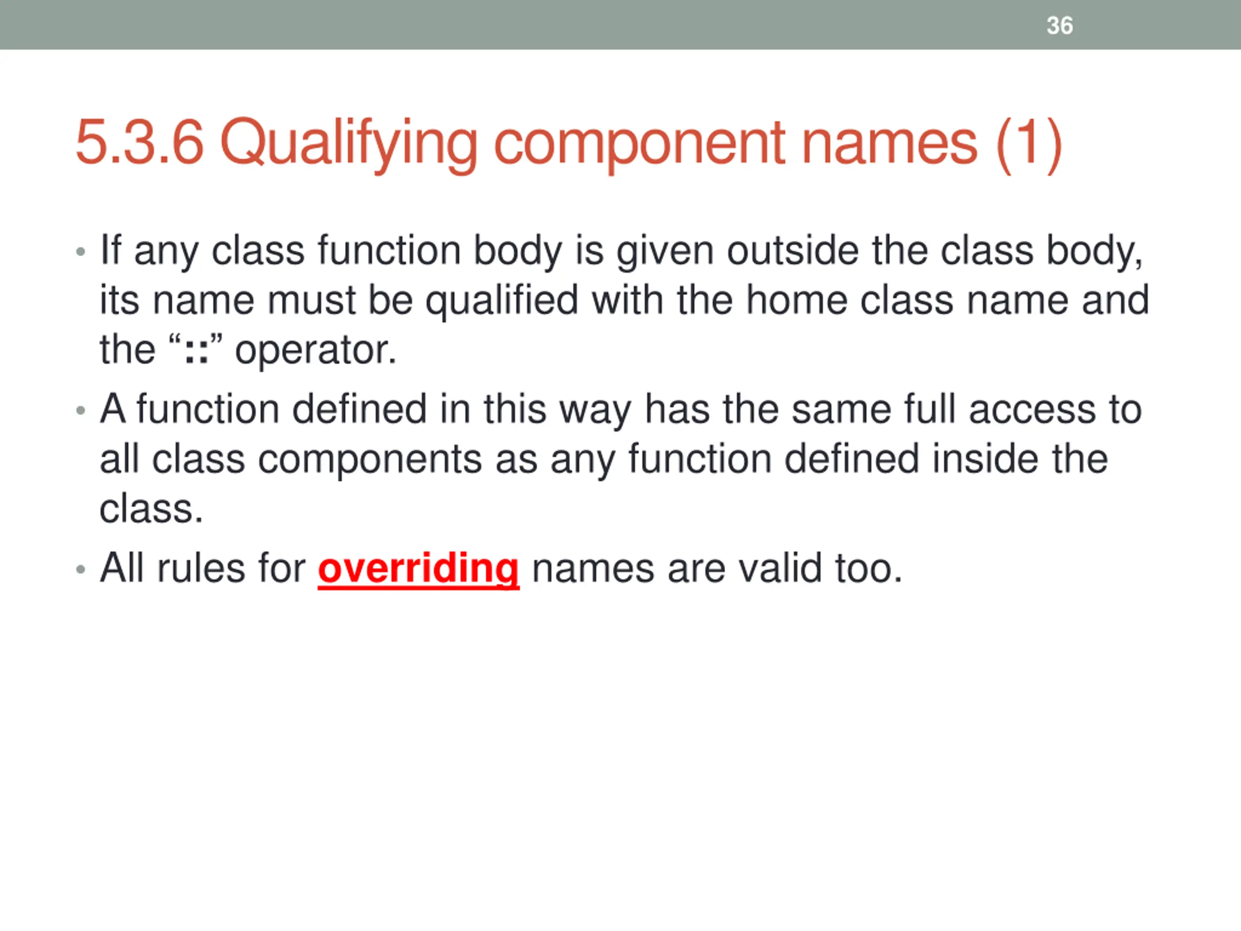 36 5.3.6 Qualifying component names (1) If any class function body is given outside the class body, its name must be qualified with the home class name and the :: operator. A function defined in this way has the same full access to all class components as any function defined inside the class. All rules for overriding names are valid too.