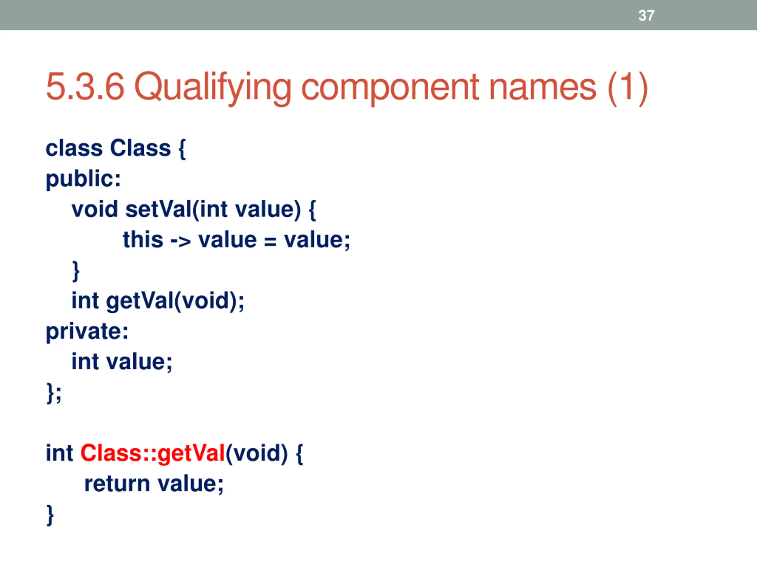 37 5.3.6 Qualifying component names (1) class Class { public: void setVal(int value) { this -> value = value; } int getVal(void); private: int value; }; int Class::getVal(void) { return value; }