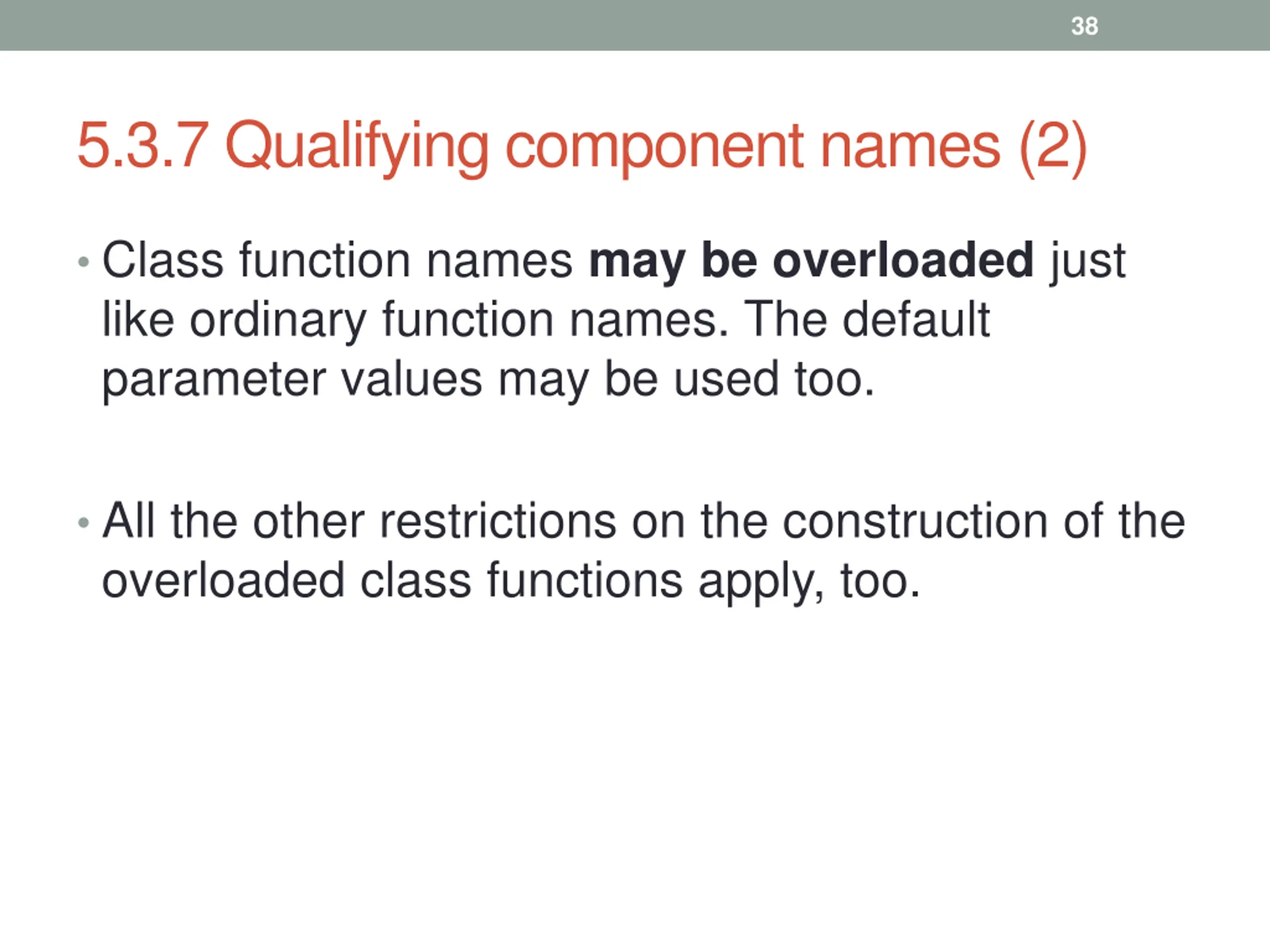 38 5.3.7 Qualifying component names (2) Class function names may be overloaded just like ordinary function names. The default parameter values may be used too. All the other restrictions on the construction of the overloaded class functions apply, too.
