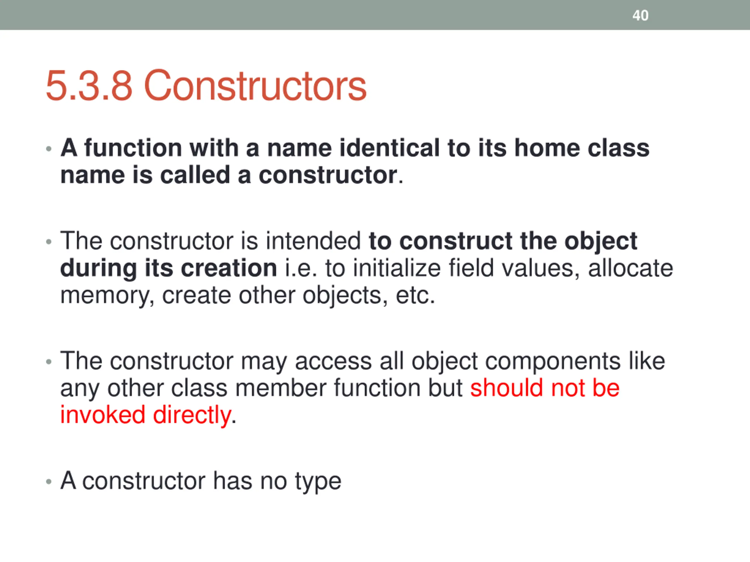 40 5.3.8 Constructors A function with a name identical to its home class name is called a constructor. The constructor is intended to construct the object during its creation i.e. to initialize field values, allocate memory, create other objects, etc. The constructor may access all object components like any other class member function but should not be invoked directly. A constructor has no type