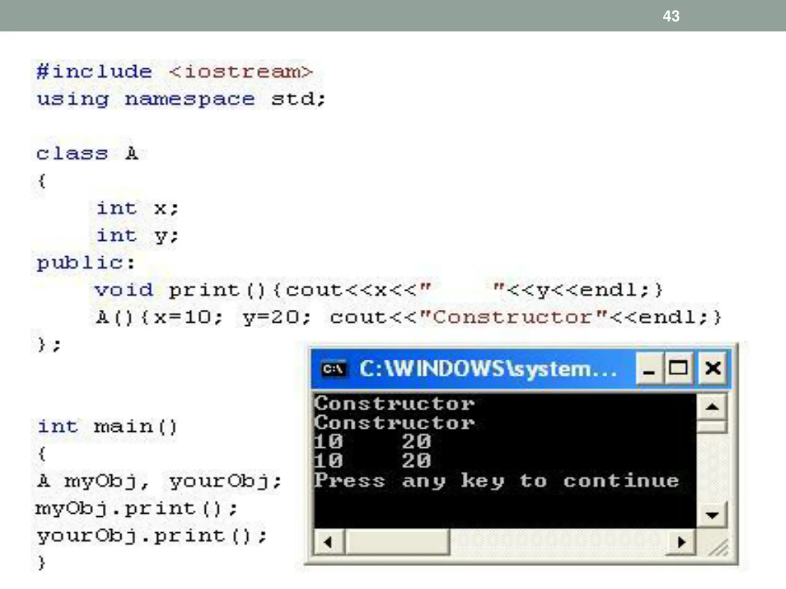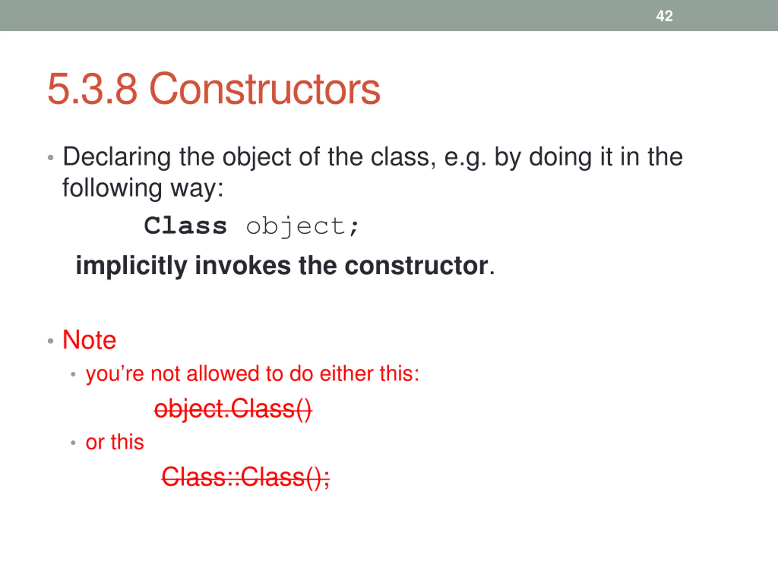 42 5.3.8 Constructors Declaring the object of the class, e.g. by doing it in the following way: Class object; implicitly invokes the constructor. Note you re not allowed to do either this: object.Class() or this Class::Class();