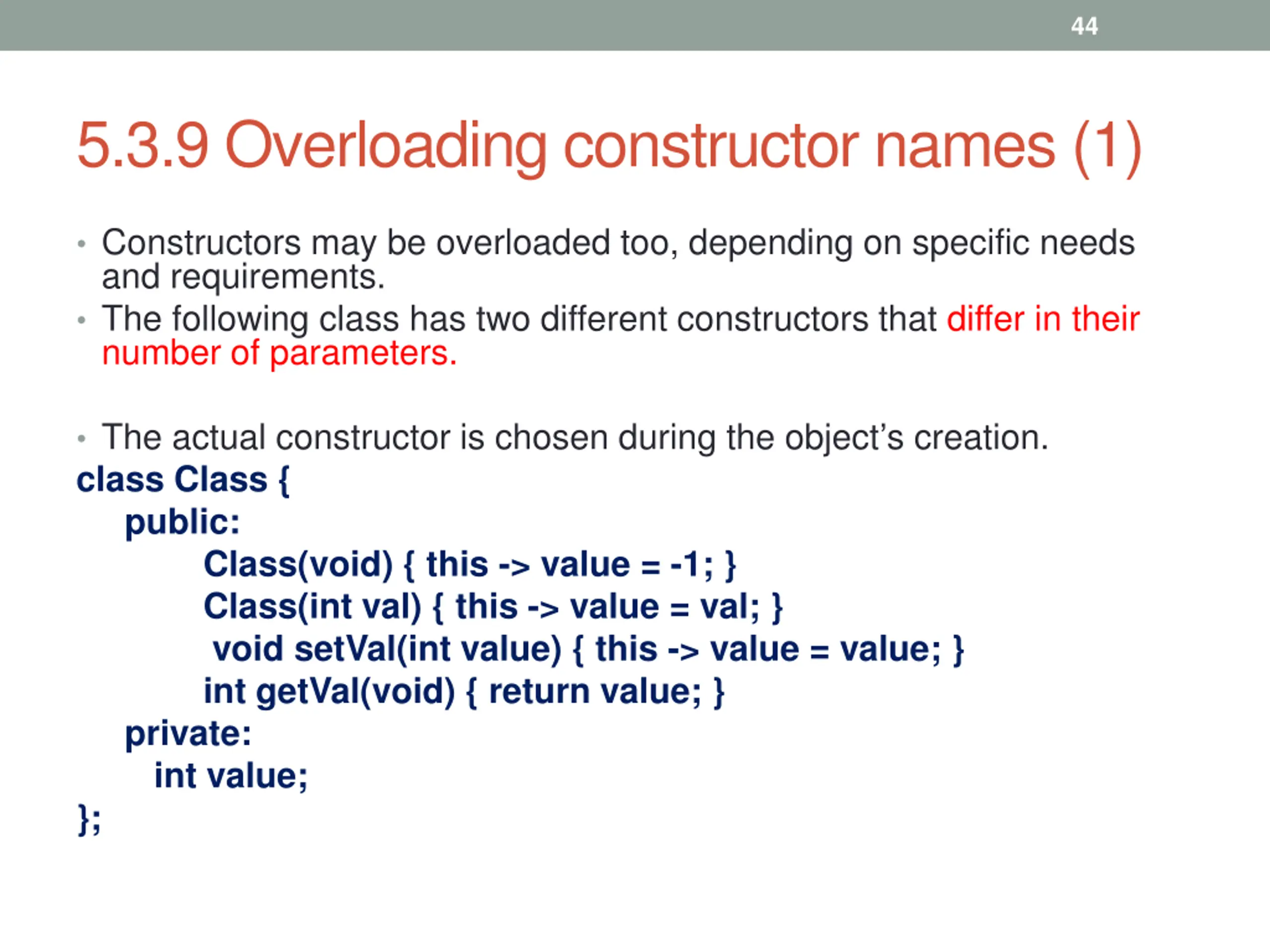 44 5.3.9 Overloading constructor names (1) Constructors may be overloaded too, depending on specific needs and requirements. The following class has two different constructors that differ in their number of parameters. The actual constructor is chosen during the object s creation. class Class { public: Class(void) { this -> value = -1; } Class(int val) { this -> value = val; } void setVal(int value) { this -> value = value; } int getVal(void) { return value; } private: int value; };