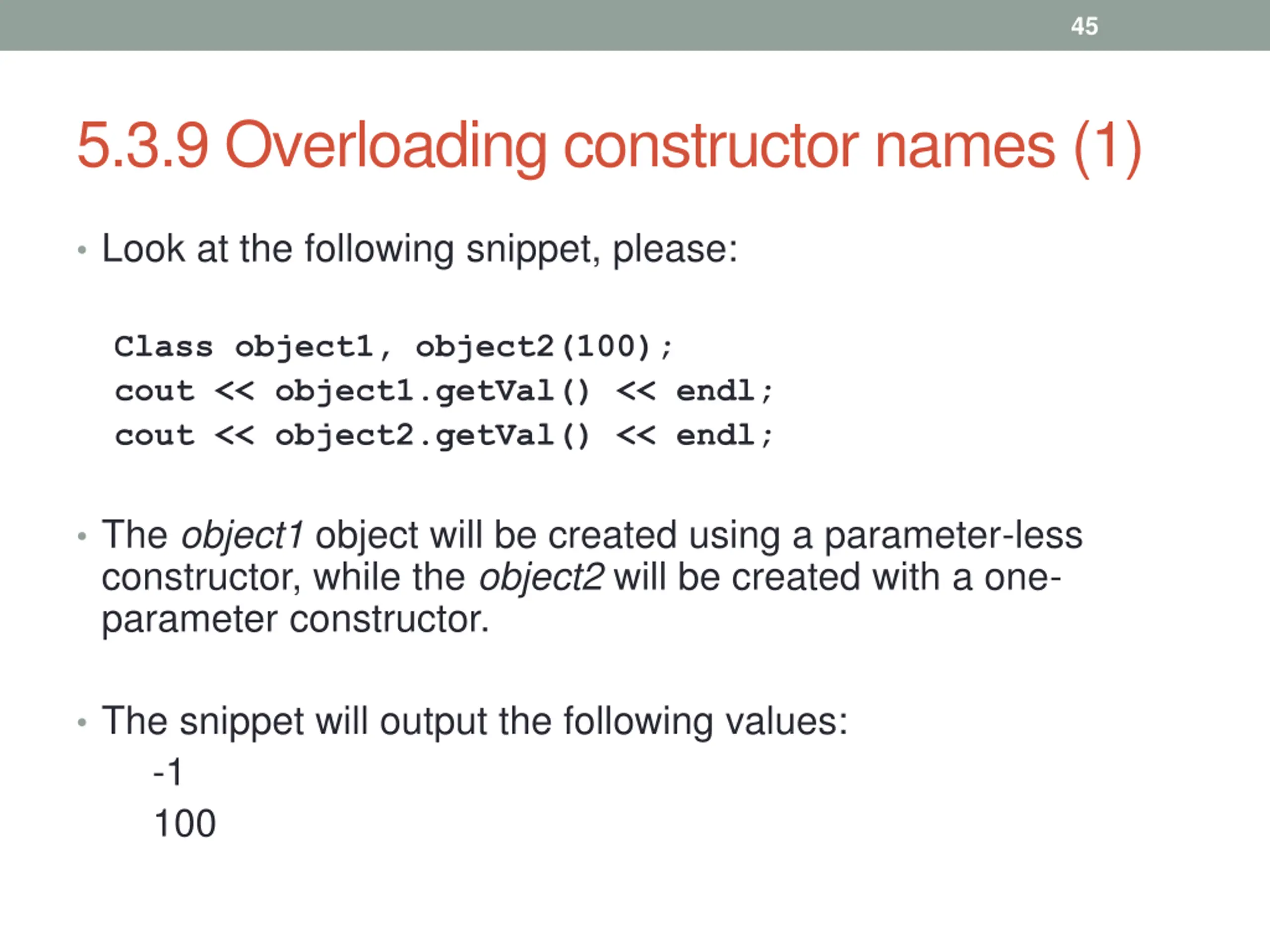 45 5.3.9 Overloading constructor names (1) Look at the following snippet, please: Class object1, object2(100); cout << object1.getVal() << endl; cout << object2.getVal() << endl; The object1 object will be created using a parameter-less constructor, while the object2 will be created with a one- parameter constructor. The snippet will output the following values: -1 100