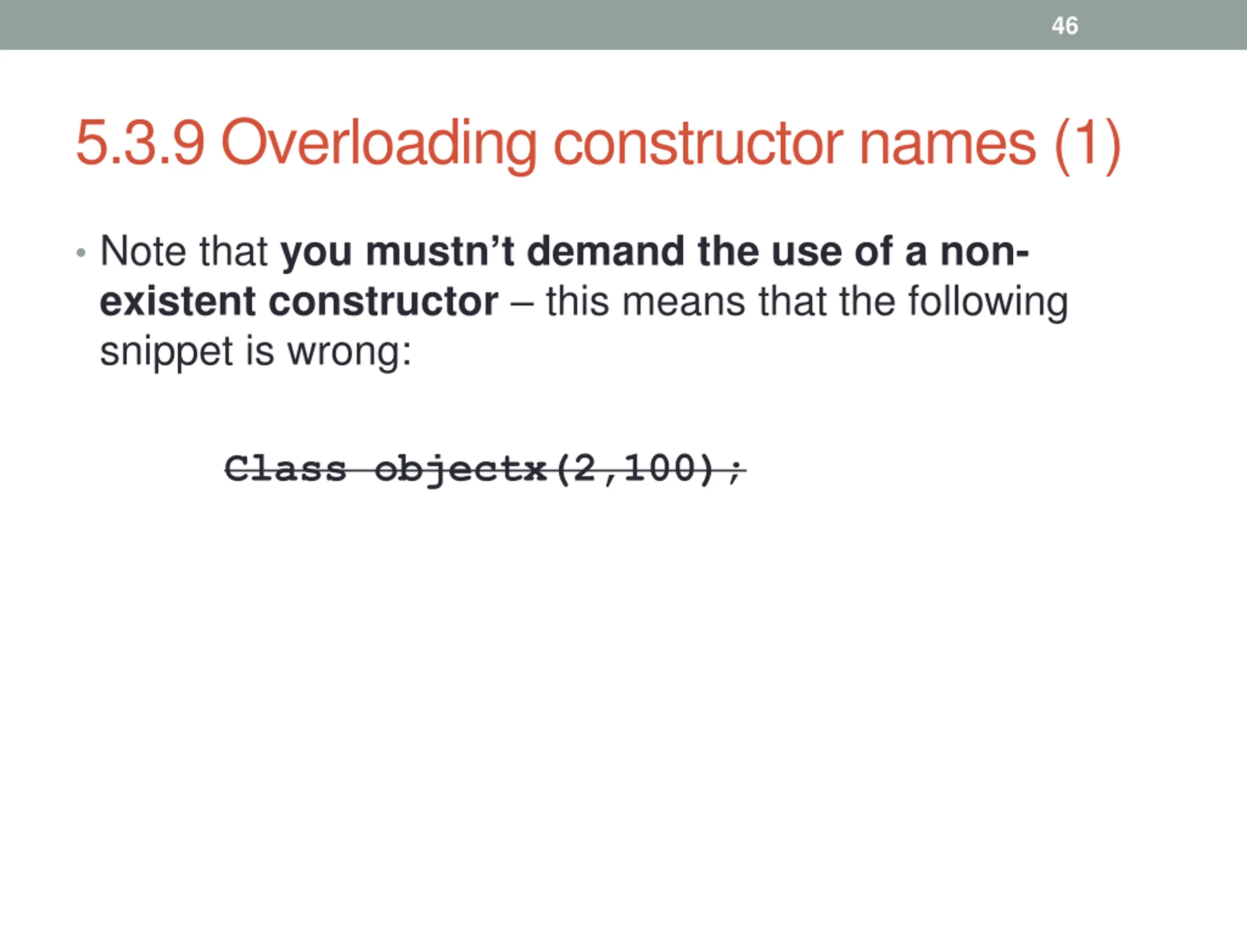 46 5.3.9 Overloading constructor names (1) Note that you mustn t demand the use of a non- existent constructor this means that the following snippet is wrong: Class objectx(2,100);