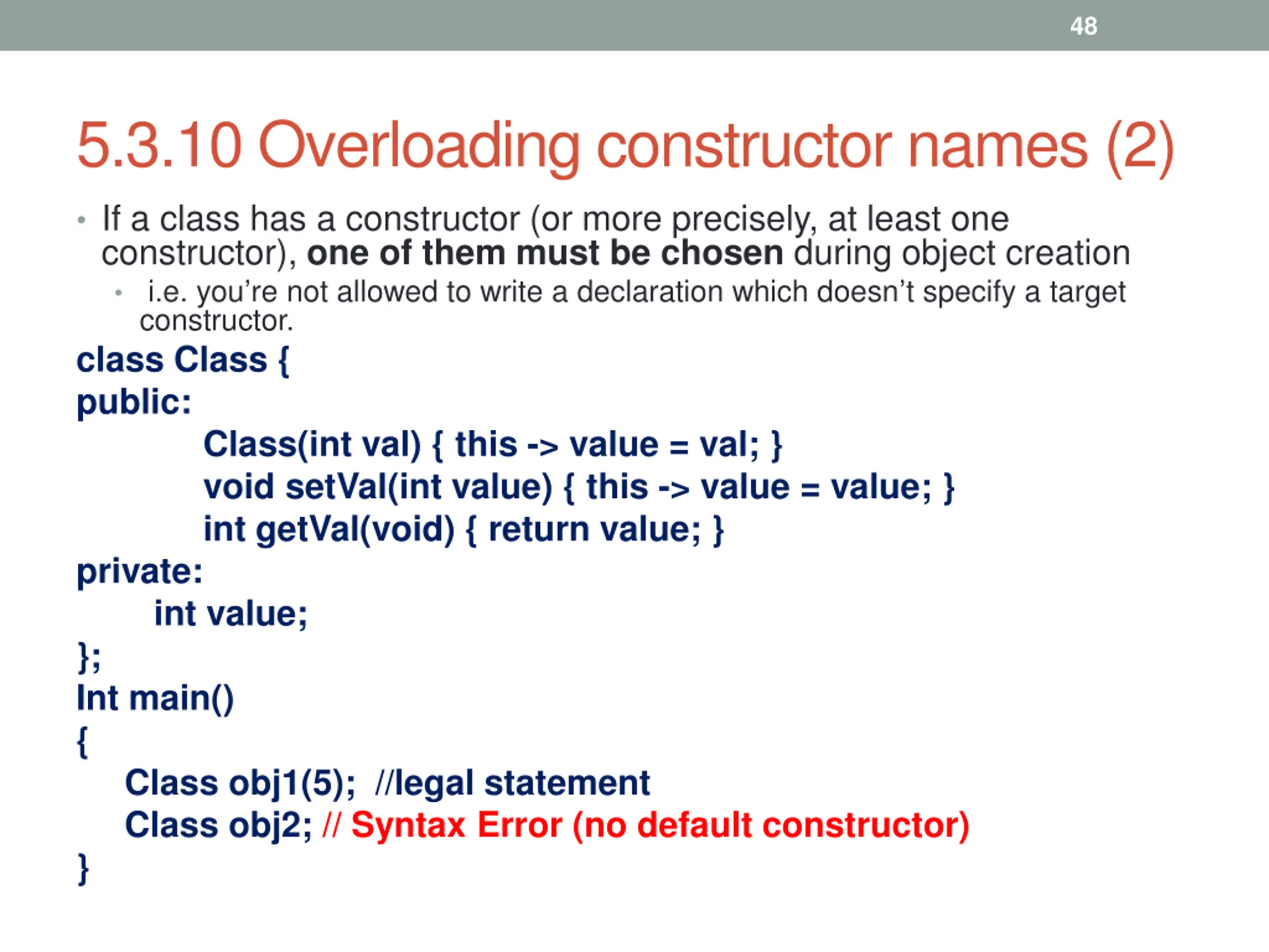 48 5.3.10 Overloading constructor names (2) If a class has a constructor (or more precisely, at least one constructor), one of them must be chosen during object creation i.e. you re not allowed to write a declaration which doesn t specify a target constructor. class Class { public: Class(int val) { this -> value = val; } void setVal(int value) { this -> value = value; } int getVal(void) { return value; } private: int value; }; Int main() { Class obj1(5); //legal statement Class obj2; // Syntax Error (no default constructor) }