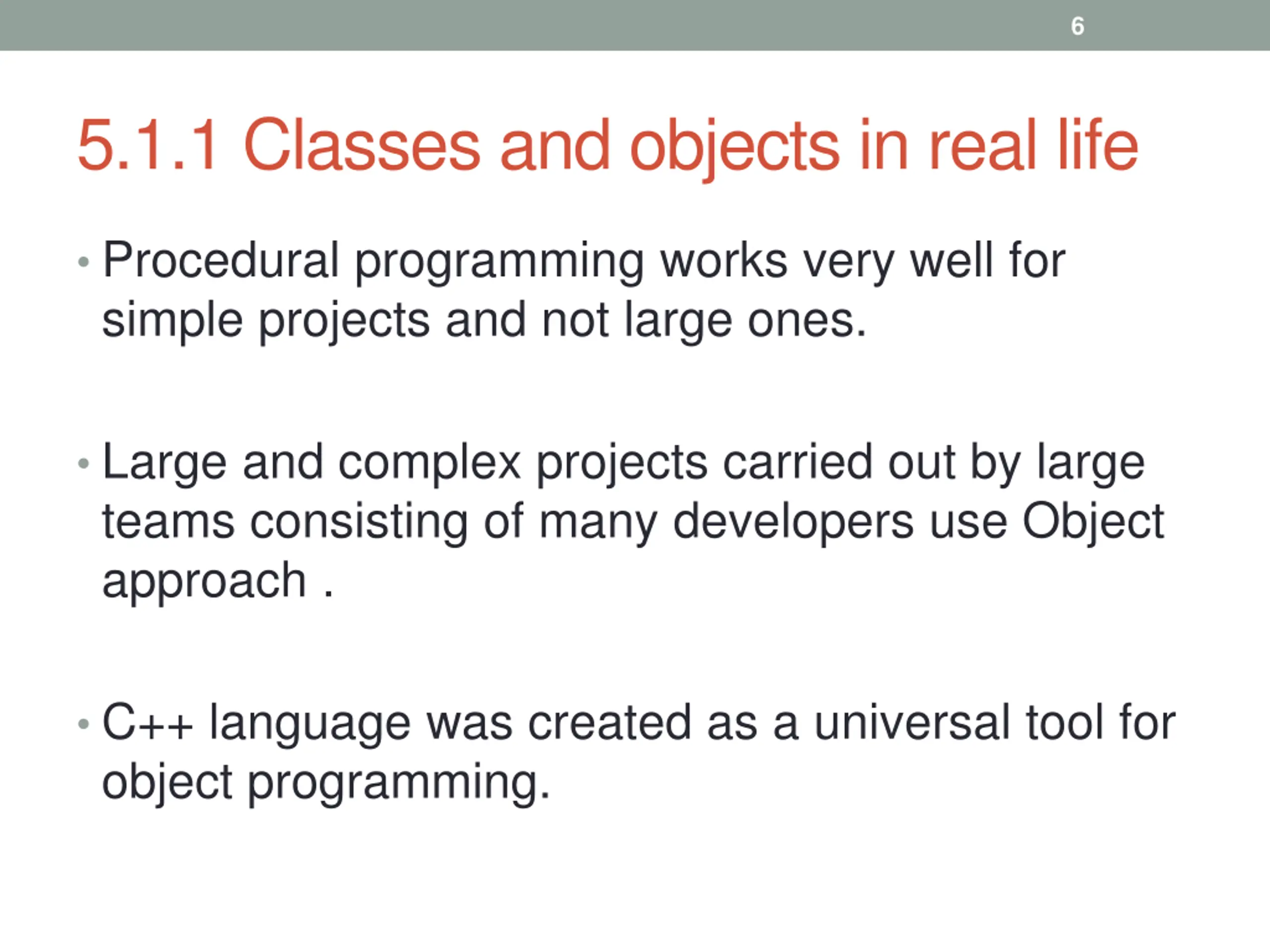 6 5.1.1 Classes and objects in real life Procedural programming works very well for simple projects and not large ones. Large and complex projects carried out by large teams consisting of many developers use Object approach . C++ language was created as a universal tool for object programming.
