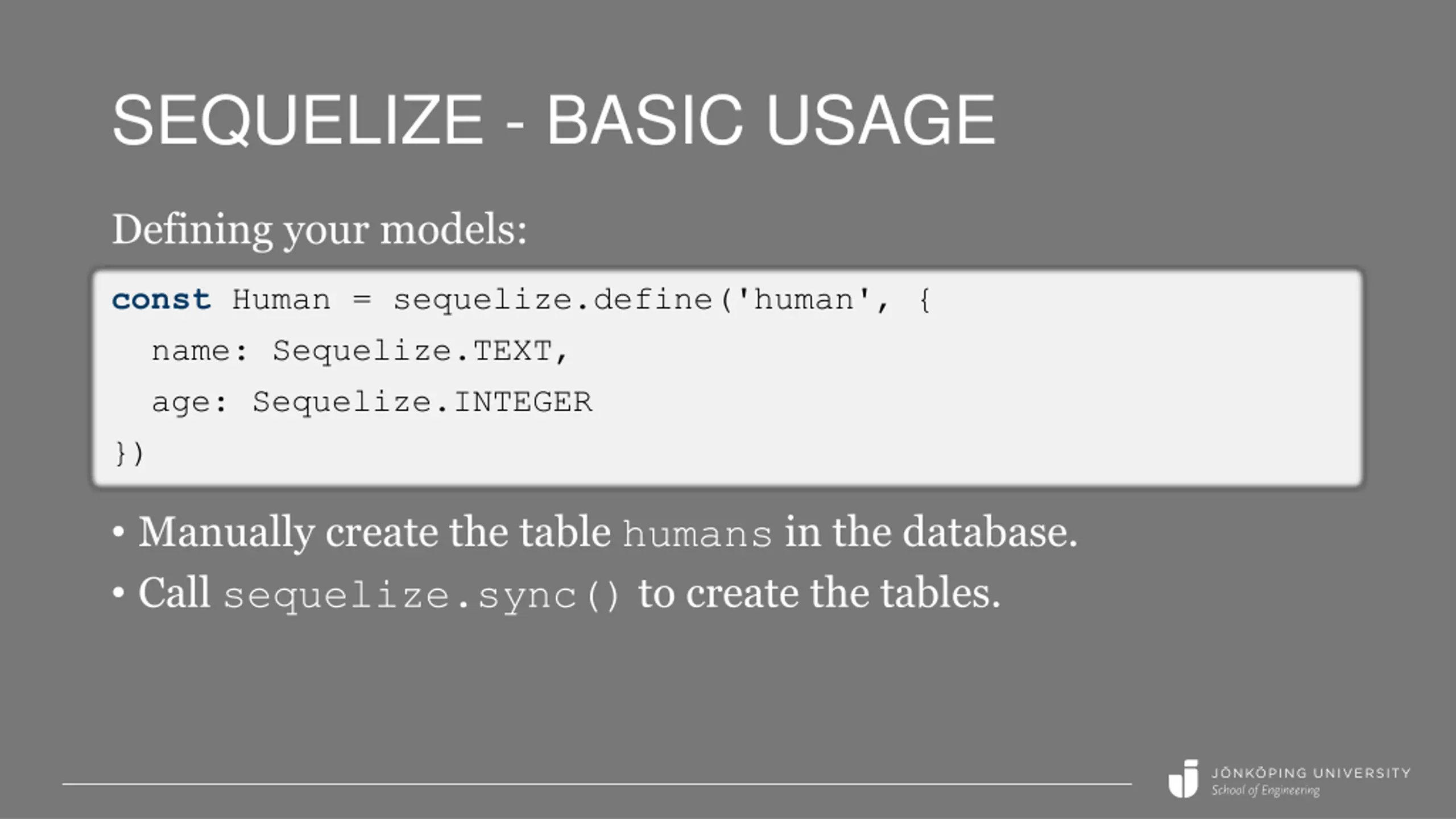 SEQUELIZE - BASIC USAGE Defining your models: const Human = sequelize.define('human', { name: Sequelize.TEXT, age: Sequelize.INTEGER }) Manually create the table humans in the database. Call sequelize.sync() to create the tables.