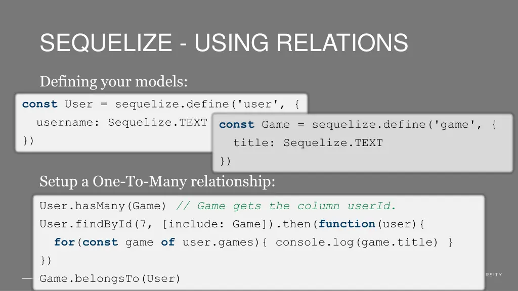 SEQUELIZE - USING RELATIONS Defining your models: const User = sequelize.define('user', { username: Sequelize.TEXT }) const Game = sequelize.define('game', { title: Sequelize.TEXT }) Setup a One-To-Many relationship: User.hasMany(Game) // Game gets the column userId. User.findById(7, [include: Game]).then(function(user){ for(const game of user.games){ console.log(game.title) } }) Game.belongsTo(User)