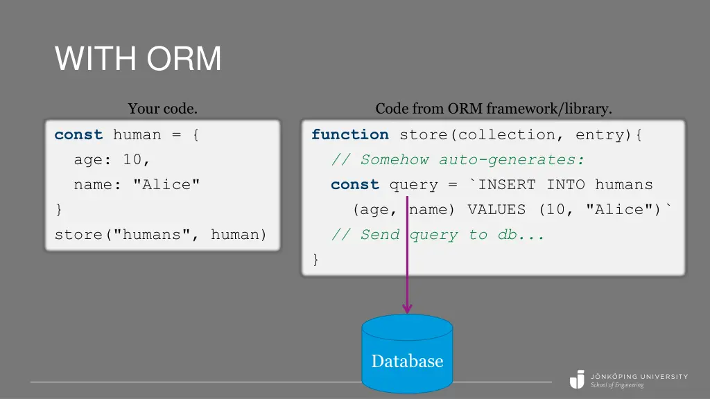 WITH ORM Your code. Code from ORM framework/library. const human = { age: 10, name: "Alice" } store("humans", human) function store(collection, entry){ // Somehow auto-generates: const query = `INSERT INTO humans (age, name) VALUES (10, "Alice")` // Send query to db... } Database
