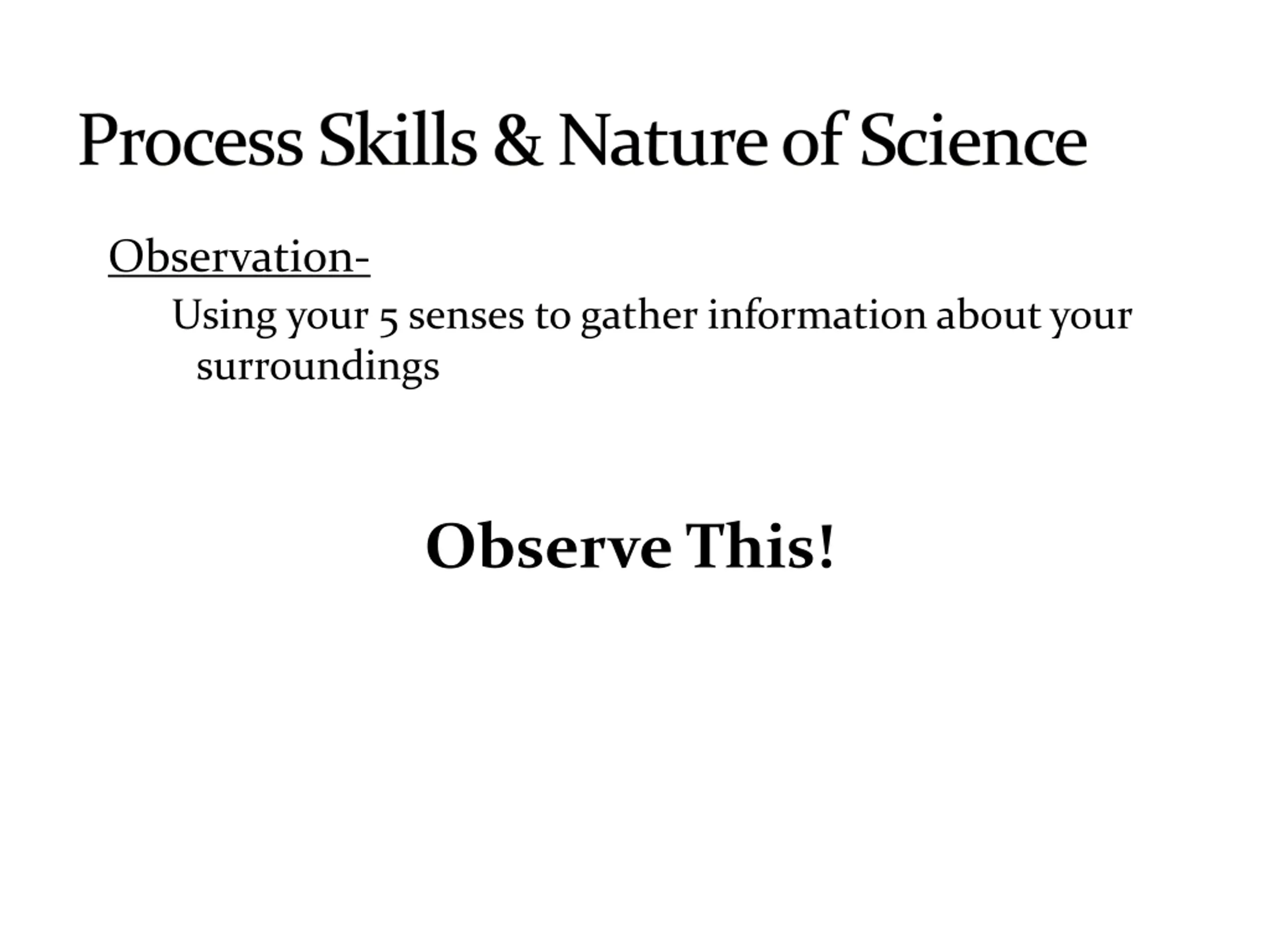 Process Skills & Nature of Science Observation- Using your 5 senses to gather information about your surroundings Observe This!