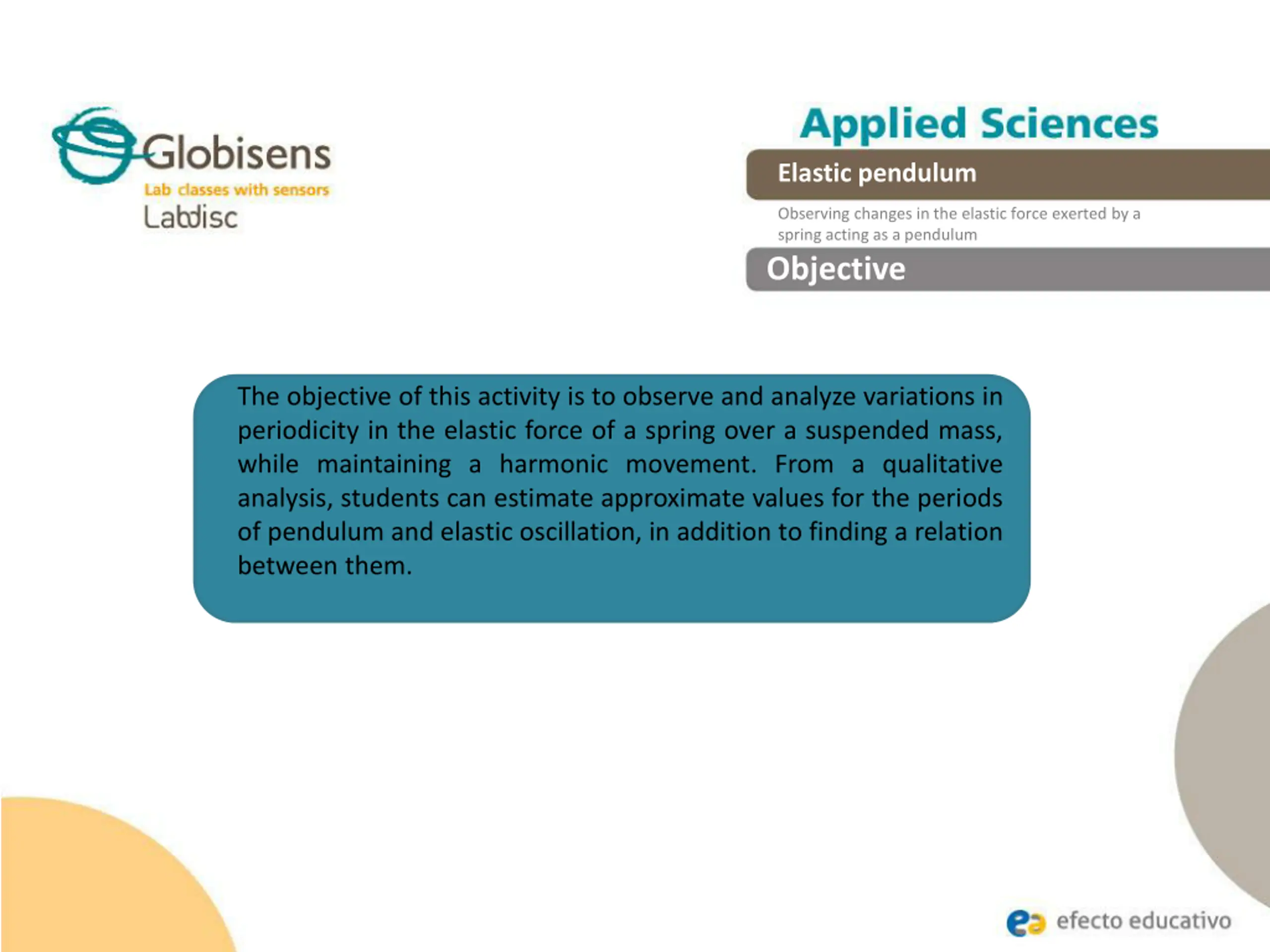 Elastic pendulum Observing changes in the elastic force exerted by a spring acting as a pendulum Objective The objective of this activity is to observe and analyze variations in periodicity in the elastic force of a spring over a suspended mass, while maintaining a harmonic movement. From a qualitative analysis, students can estimate approximate values for the periods of pendulum and elastic oscillation, in addition to finding a relation between them.