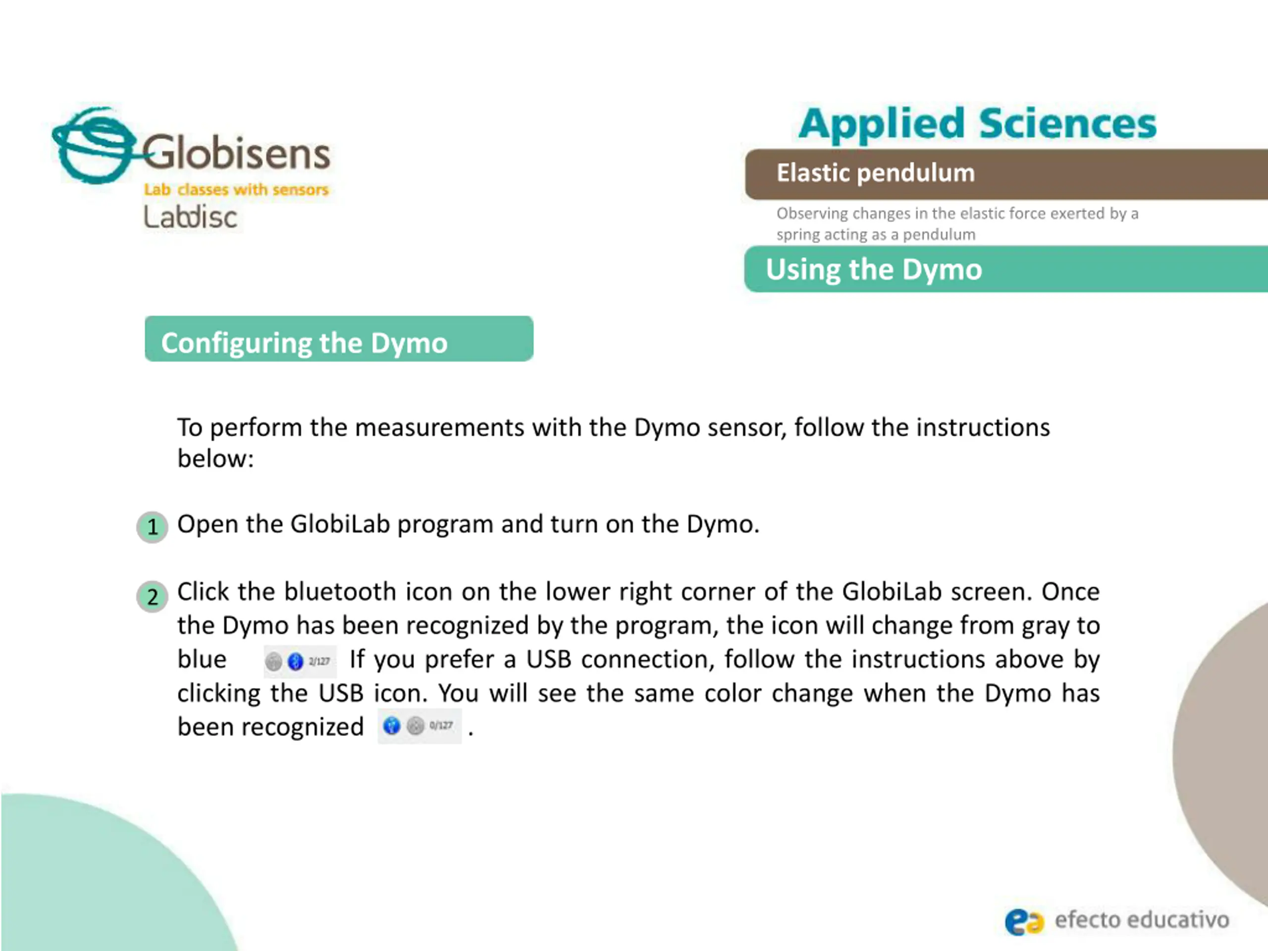 Elastic pendulum Observing changes in the elastic force exerted by a spring acting as a pendulum Using the Dymo Configuring the Dymo To perform the measurements with the Dymo sensor, follow the instructions below: Open the GlobiLab program and turn on the Dymo. 1 Click the bluetooth icon on the lower right corner of the GlobiLab screen. Once the Dymo has been recognized by the program, the icon will change from gray to blue . If you prefer a USB connection, follow the instructions above by clicking the USB icon. You will see the same color change when the Dymo has been recognized . 2