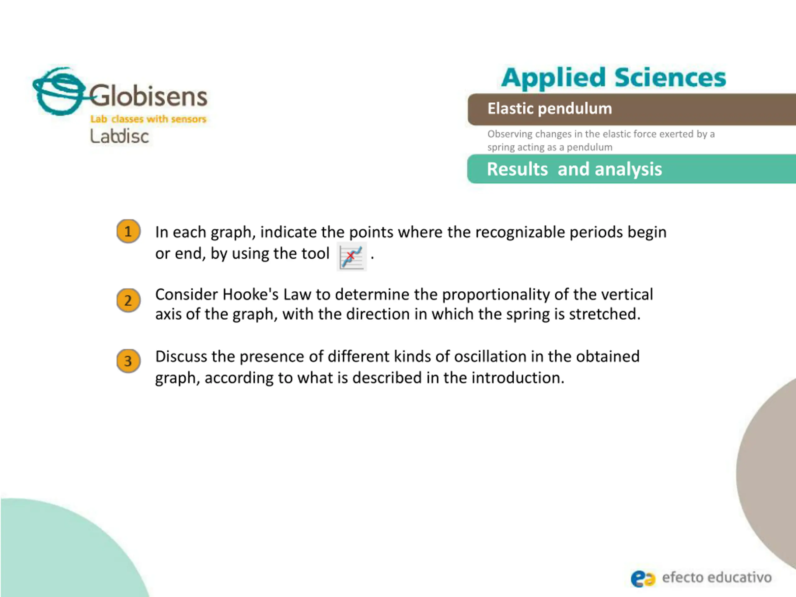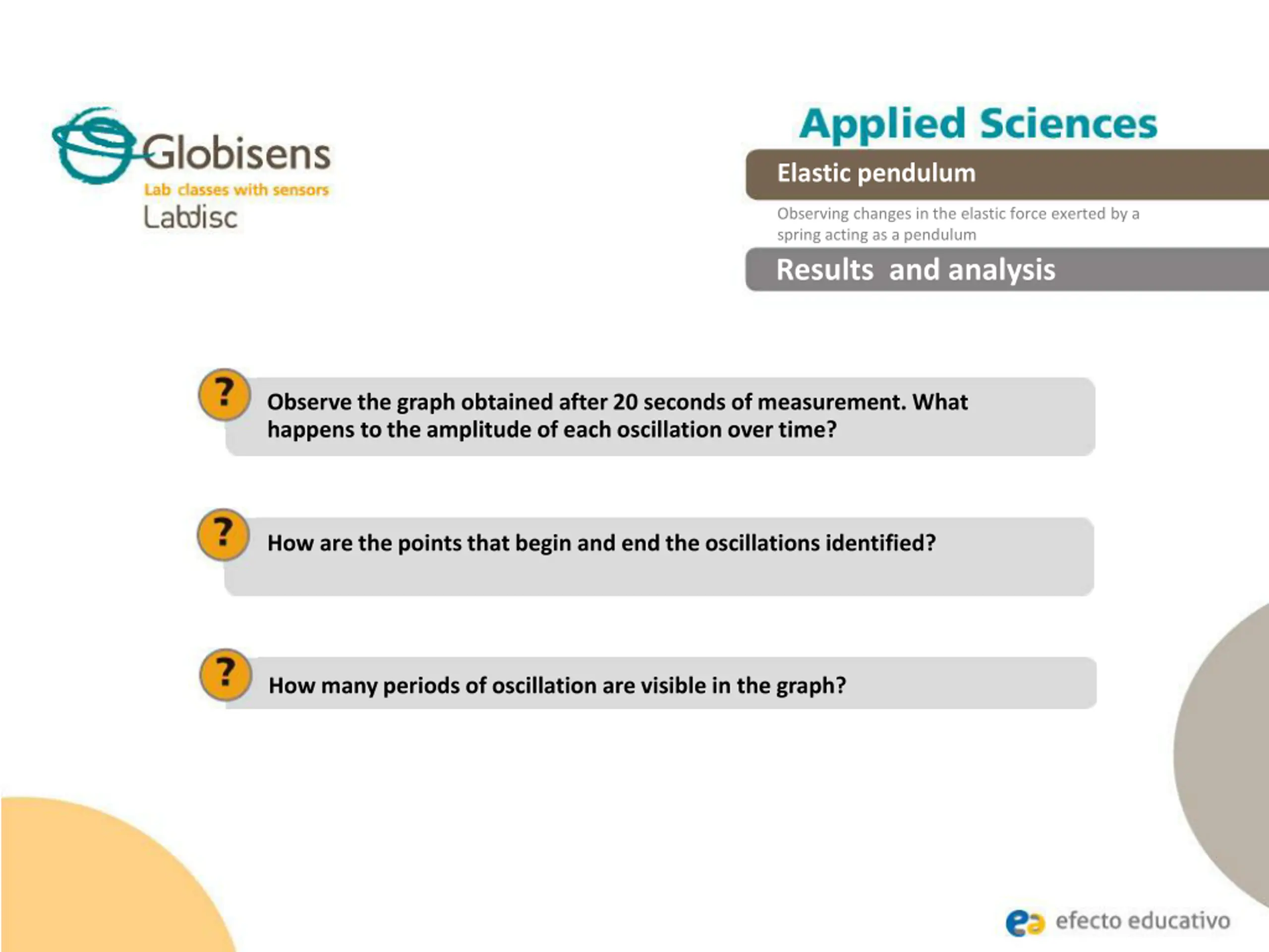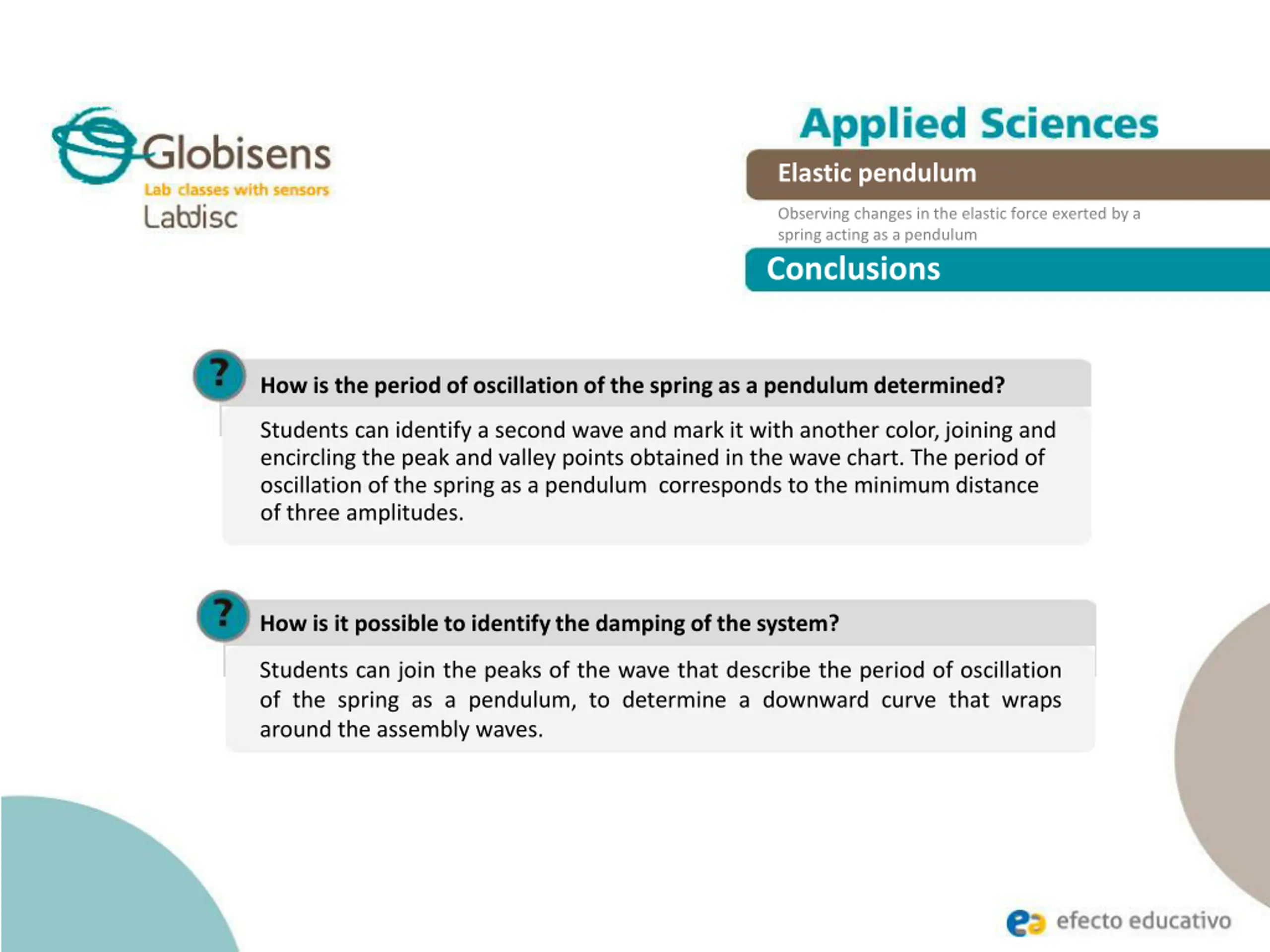 Elastic pendulum Observing changes in the elastic force exerted by a spring acting as a pendulum Conclusions How is the period of oscillation of the spring as a pendulum determined? Students can identify a second wave and mark it with another color, joining and encircling the peak and valley points obtained in the wave chart. The period of oscillation of the spring as a pendulum corresponds to the minimum distance of three amplitudes. How is it possible to identify the damping of the system? Students can join the peaks of the wave that describe the period of oscillation of the spring as a pendulum, to determine a downward curve that wraps around the assembly waves.