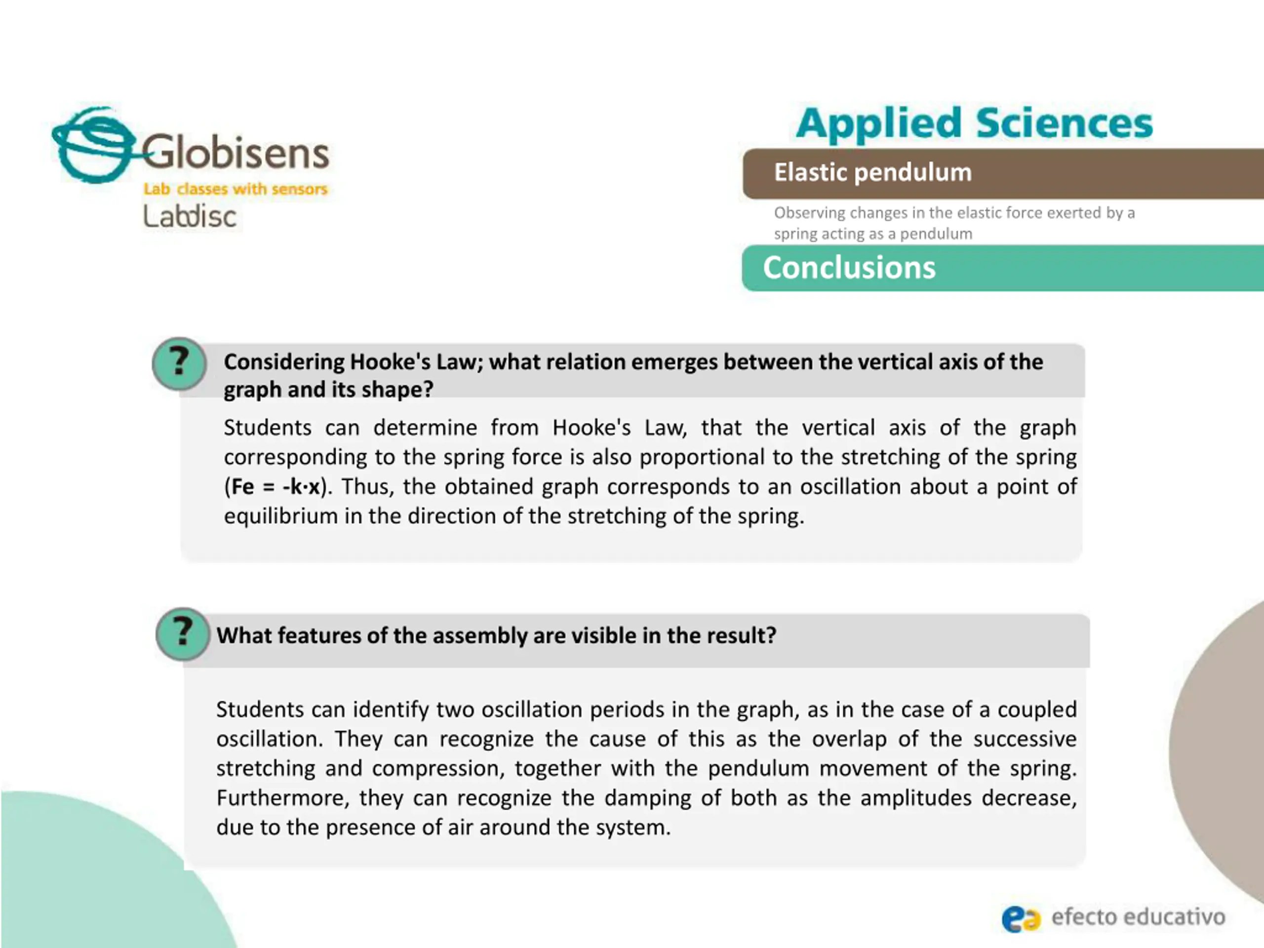 Elastic pendulum Observing changes in the elastic force exerted by a spring acting as a pendulum Conclusions Considering Hooke's Law; what relation emerges between the vertical axis of the graph and its shape? Students can determine from Hooke's Law, that the vertical axis of the graph corresponding to the spring force is also proportional to the stretching of the spring (Fe = -k x). Thus, the obtained graph corresponds to an oscillation about a point of equilibrium in the direction of the stretching of the spring. What features of the assembly are visible in the result? Students can identify two oscillation periods in the graph, as in the case of a coupled oscillation. They can recognize the cause of this as the overlap of the successive stretching and compression, together with the pendulum movement of the spring. Furthermore, they can recognize the damping of both as the amplitudes decrease, due to the presence of air around the system.