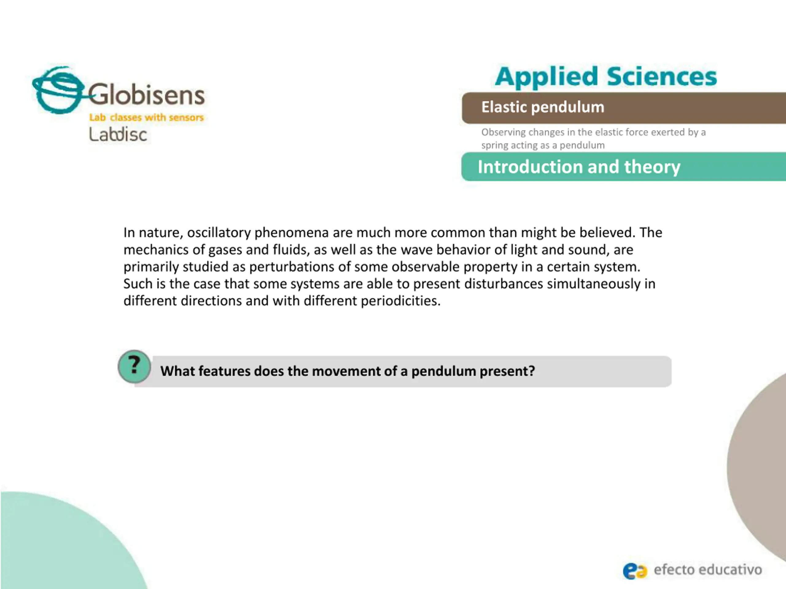 Elastic pendulum Observing changes in the elastic force exerted by a spring acting as a pendulum Introduction and theory In nature, oscillatory phenomena are much more common than might be believed. The mechanics of gases and fluids, as well as the wave behavior of light and sound, are primarily studied as perturbations of some observable property in a certain system. Such is the case that some systems are able to present disturbances simultaneously in different directions and with different periodicities. What features does the movement of a pendulum present?