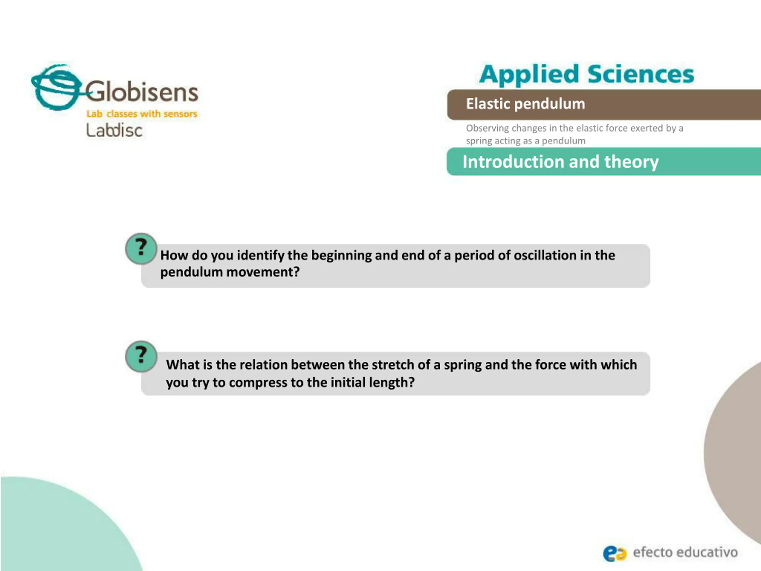 Elastic pendulum Observing changes in the elastic force exerted by a spring acting as a pendulum Introduction and theory How do you identify the beginning and end of a period of oscillation in the pendulum movement? What is the relation between the stretch of a spring and the force with which you try to compress to the initial length?