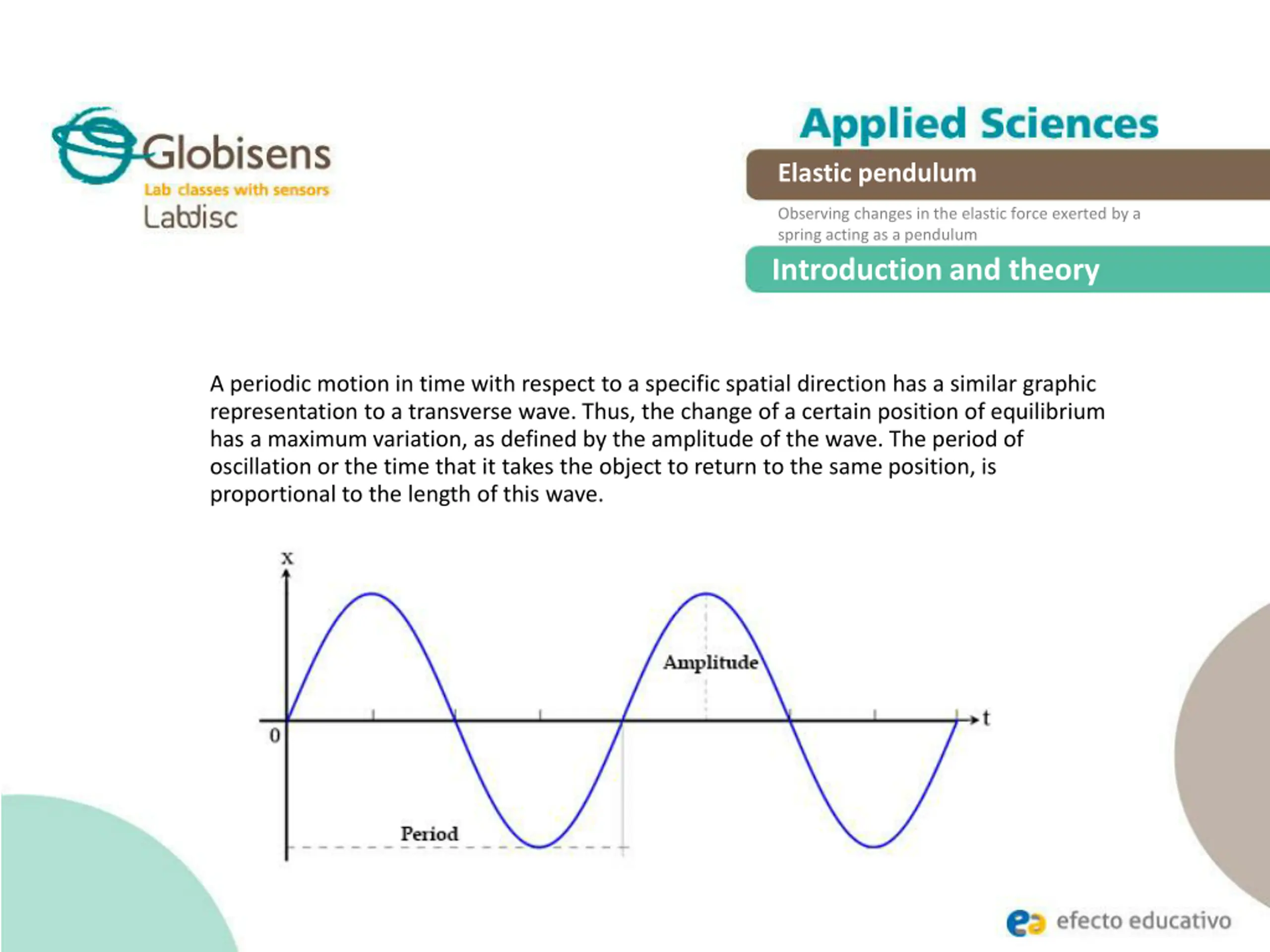 Elastic pendulum Observing changes in the elastic force exerted by a spring acting as a pendulum Introduction and theory Teor a A periodic motion in time with respect to a specific spatial direction has a similar graphic representation to a transverse wave. Thus, the change of a certain position of equilibrium has a maximum variation, as defined by the amplitude of the wave. The period of oscillation or the time that it takes the object to return to the same position, is proportional to the length of this wave.