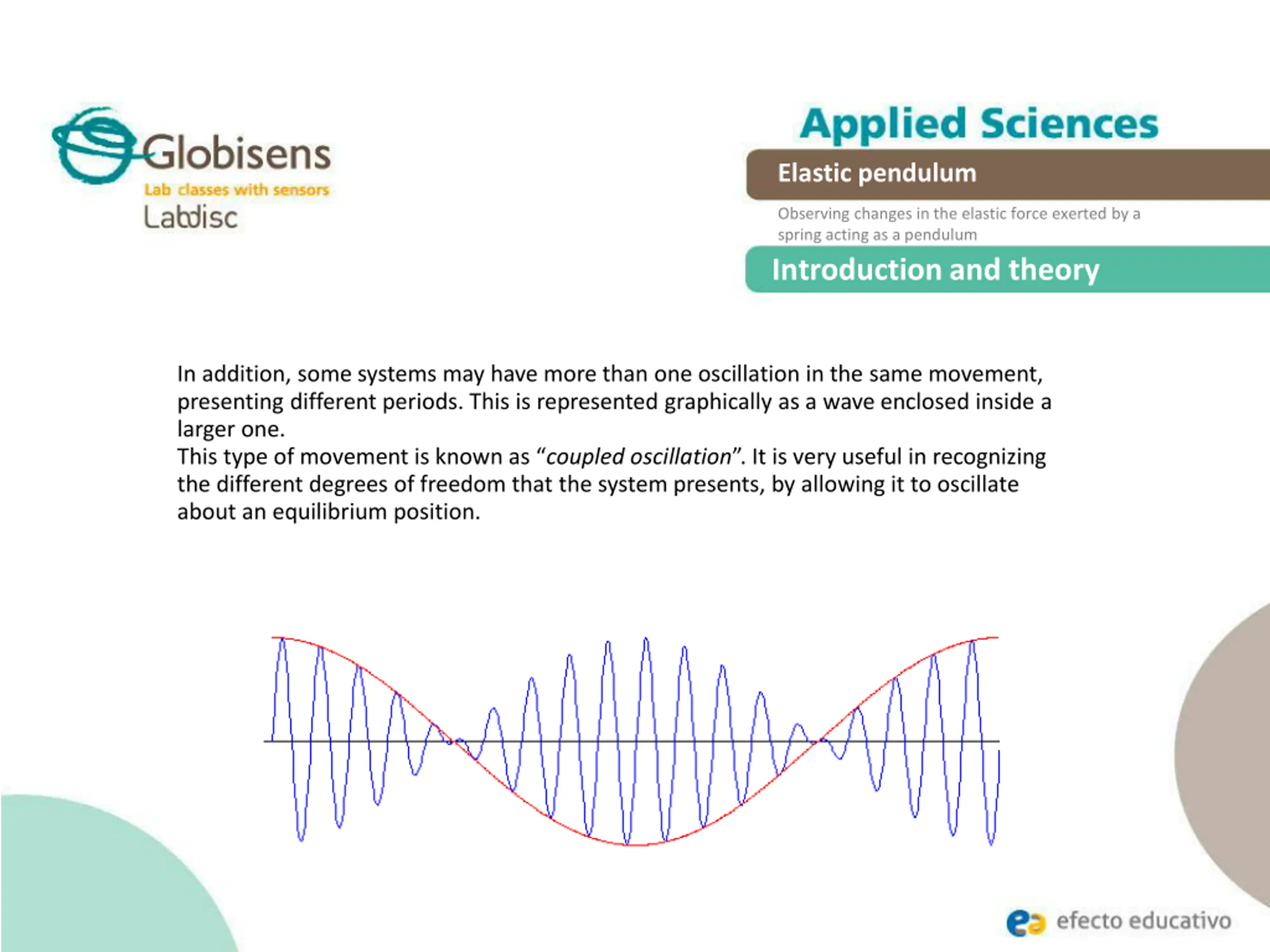 Elastic pendulum Observing changes in the elastic force exerted by a spring acting as a pendulum Introduction and theory In addition, some systems may have more than one oscillation in the same movement, presenting different periods. This is represented graphically as a wave enclosed inside a larger one. This type of movement is known as coupled oscillation . It is very useful in recognizing the different degrees of freedom that the system presents, by allowing it to oscillate about an equilibrium position.