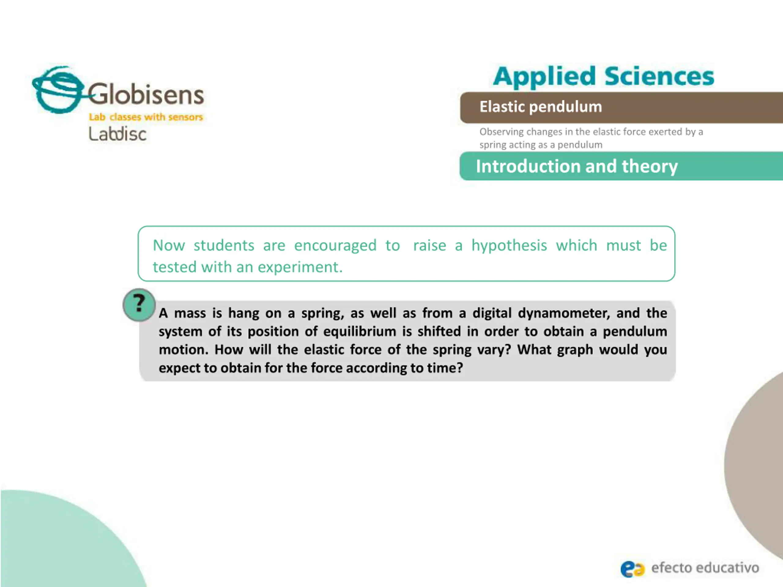 Elastic pendulum Observing changes in the elastic force exerted by a spring acting as a pendulum Introduction and theory Now students are encouraged toraise a hypothesis which must be tested with an experiment. A mass is hang on a spring, as well as from a digital dynamometer, and the system of its position of equilibrium is shifted in order to obtain a pendulum motion. How will the elastic force of the spring vary? What graph would you expect to obtain for the force according to time?