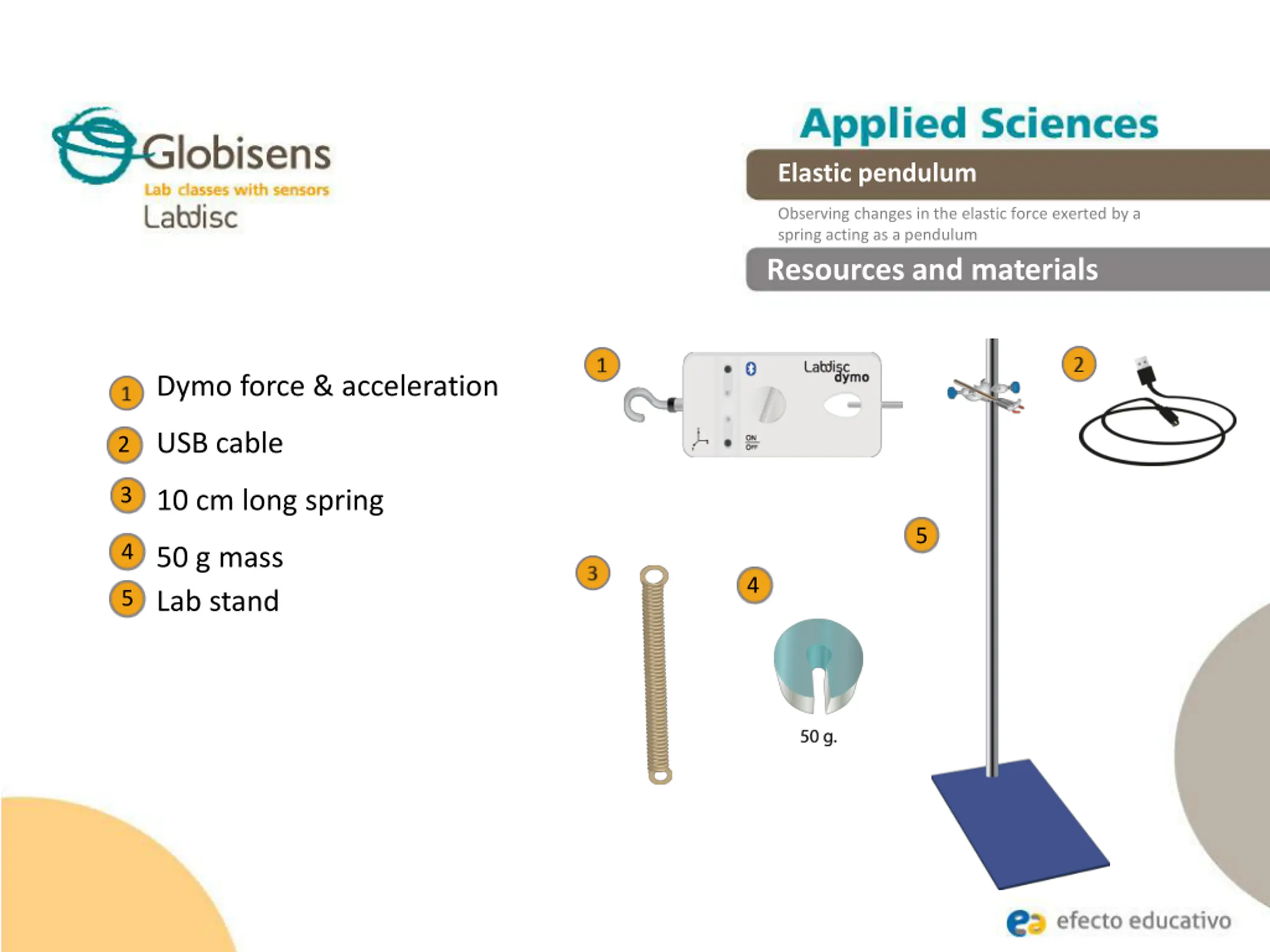 Elastic pendulum Observing changes in the elastic force exerted by a spring acting as a pendulum Activity description Students will perform a continuous measurement of the spring force at one end of the spring. Meanwhile, at the other end, a mass of a pendulum will be allowed to oscillate, so that later the graphical representation of the spring force according to time can be observed and analyzed. Knowing the relation between the elastic force and the stretching of the spring, students can infer what kind of oscillation was present in the phenomenon. To do so, they must use the Dymo force and acceleration sensor.