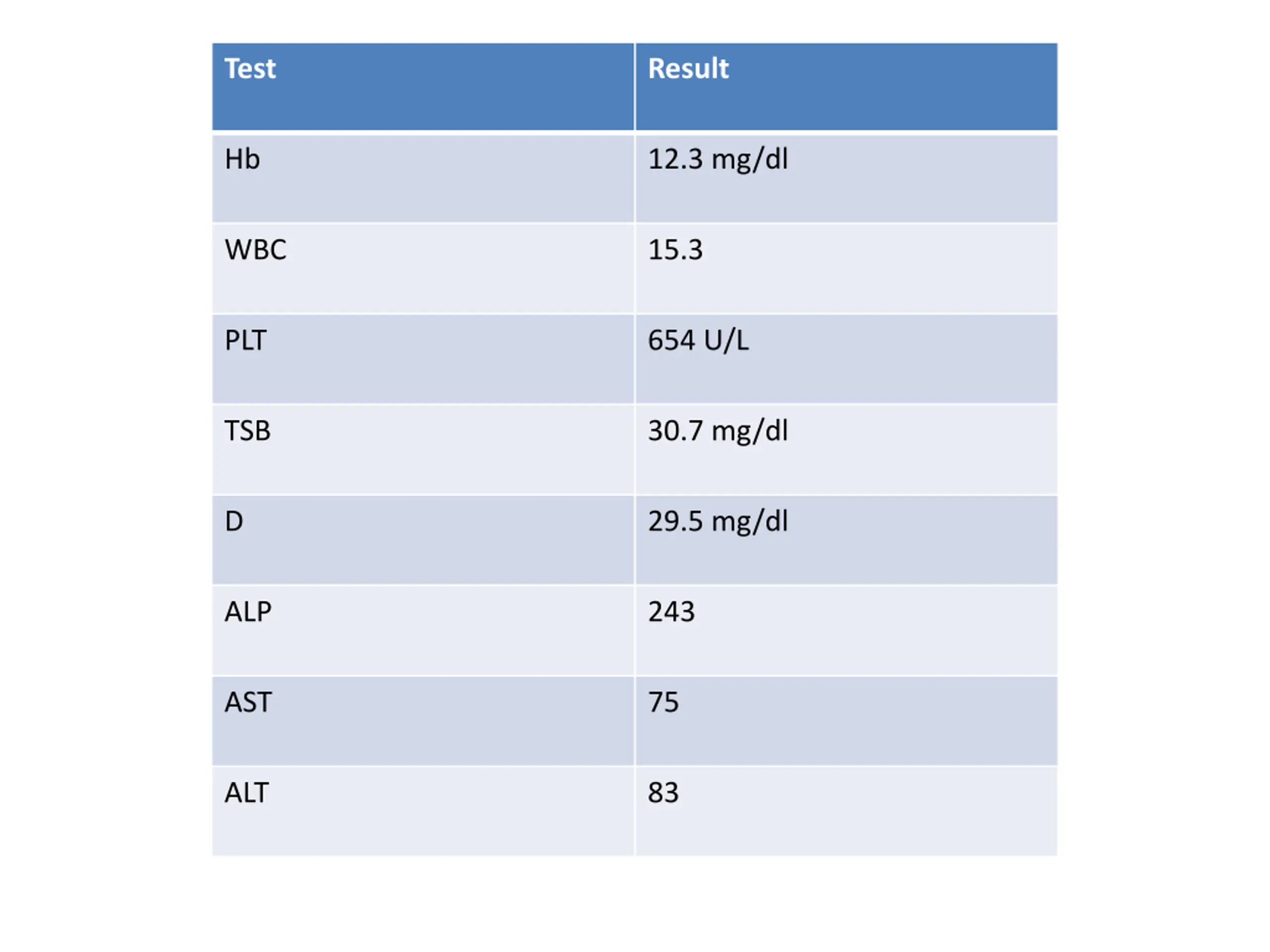 Test Result Hb 12.3 mg/dl WBC 15.3 PLT 654 U/L TSB 30.7 mg/dl D 29.5 mg/dl ALP 243 AST 75 ALT 83