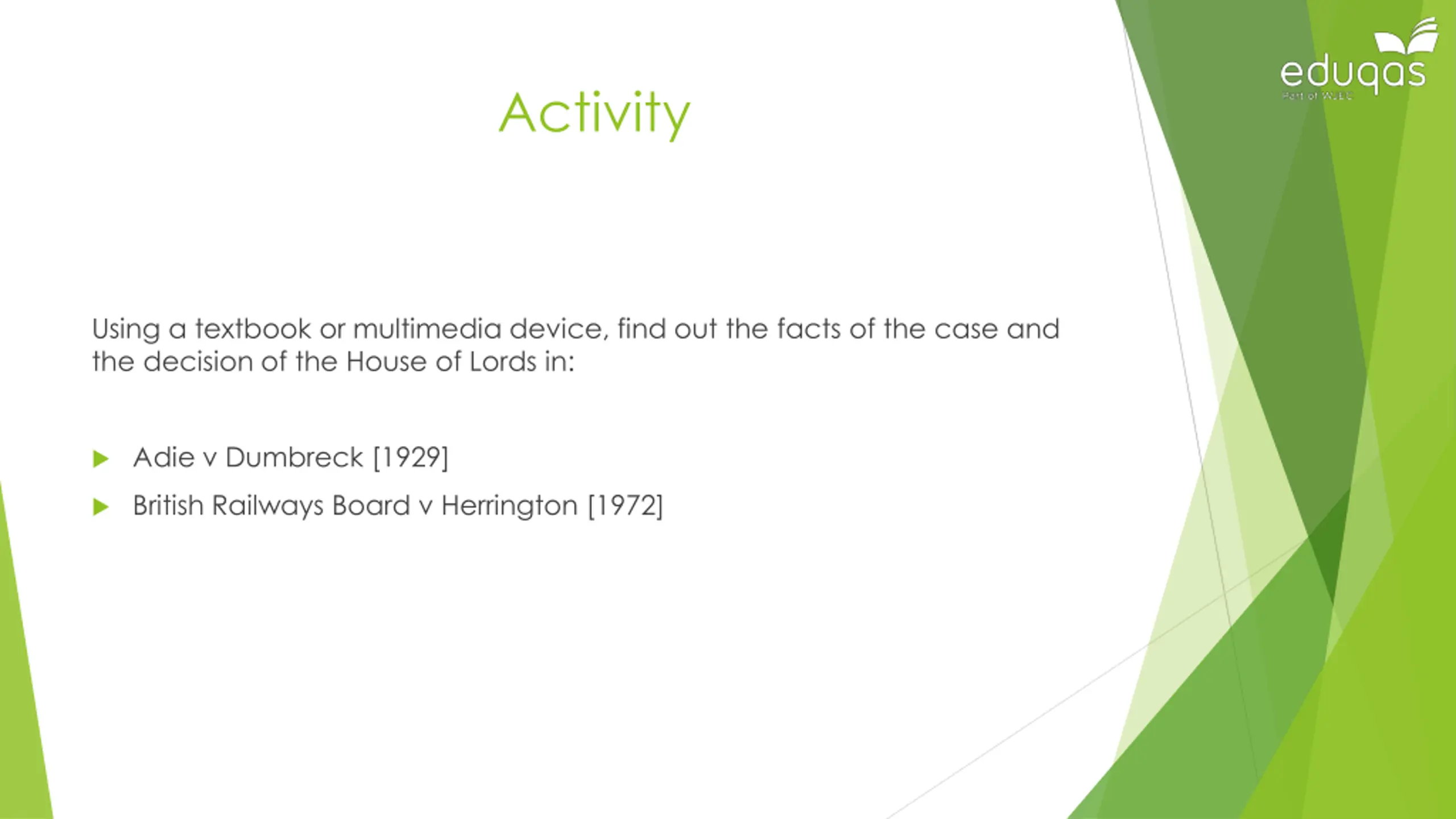 Activity Using a textbook or multimedia device, find out the facts of the case and the decision of the House of Lords in: Adie v Dumbreck [1929] British Railways Board v Herrington [1972]