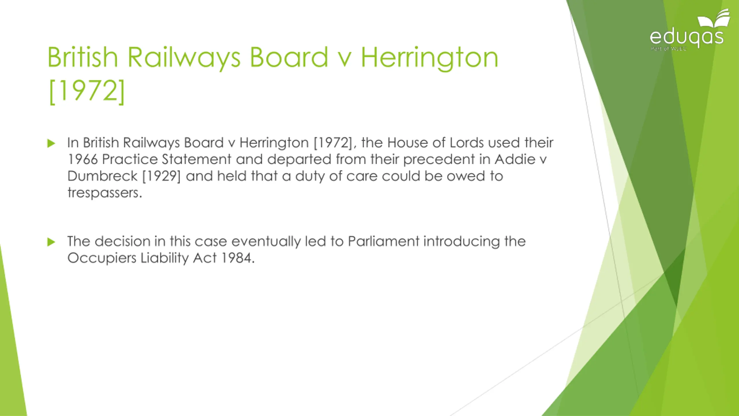 British Railways Board v Herrington [1972] In British Railways Board v Herrington [1972], the House of Lords used their 1966 Practice Statement and departed from their precedent in Addie v Dumbreck [1929] and held that a duty of care could be owed to trespassers. The decision in this case eventually led to Parliament introducing the Occupiers Liability Act 1984.