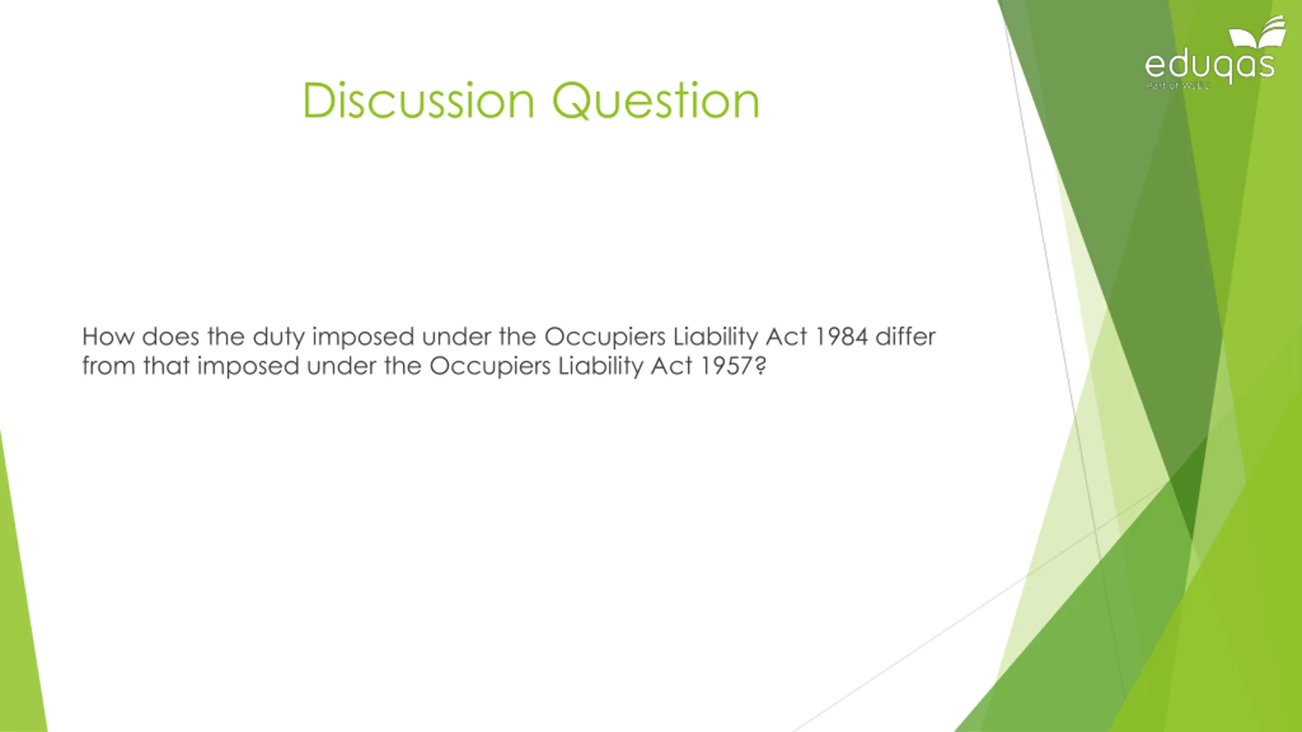 Discussion Question How does the duty imposed under the Occupiers Liability Act 1984 differ from that imposed under the Occupiers Liability Act 1957?