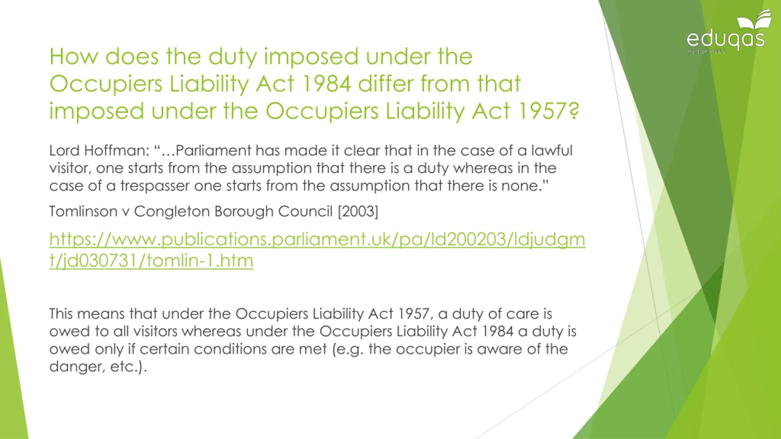 How does the duty imposed under the Occupiers Liability Act 1984 differ from that imposed under the Occupiers Liability Act 1957? Lord Hoffman: Parliament has made it clear that in the case of a lawful visitor, one starts from the assumption that there is a duty whereas in the case of a trespasser one starts from the assumption that there is none. Tomlinson v Congleton Borough Council [2003] https://www.publications.parliament.uk/pa/ld200203/ldjudgm t/jd030731/tomlin-1.htm This means that under the Occupiers Liability Act 1957, a duty of care is owed to all visitors whereas under the Occupiers Liability Act 1984 a duty is owed only if certain conditions are met (e.g. the occupier is aware of the danger, etc.).