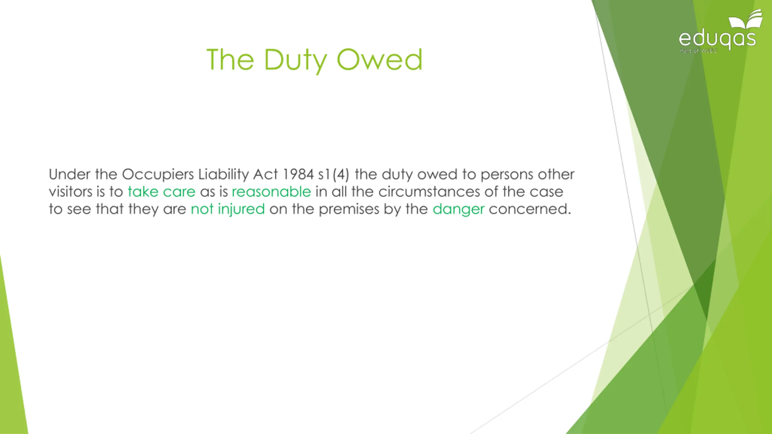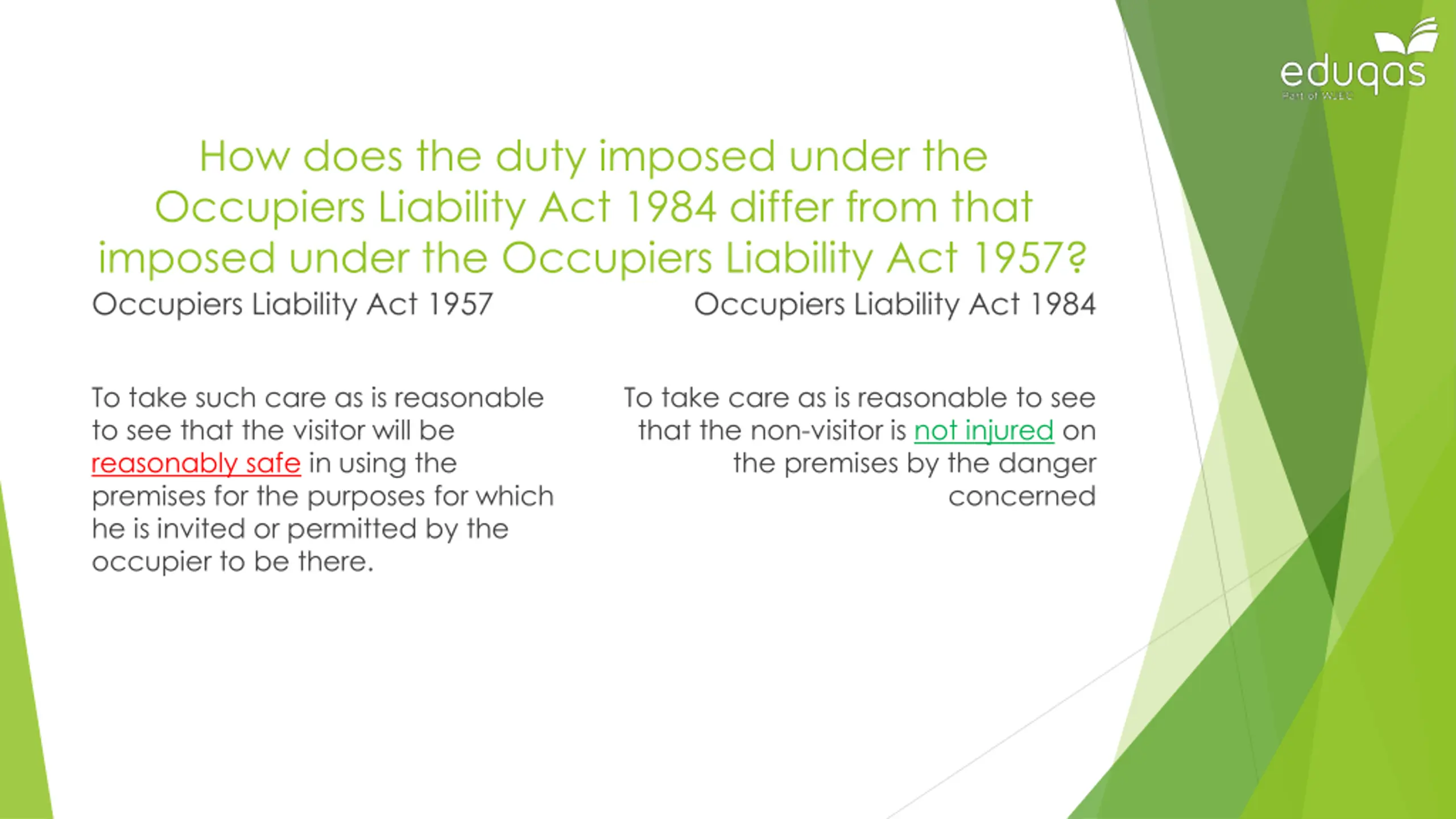 How does the duty imposed under the Occupiers Liability Act 1984 differ from that imposed under the Occupiers Liability Act 1957? Occupiers Liability Act 1957 Occupiers Liability Act 1984 To take such care as is reasonable to see that the visitor will be reasonably safe in using the premises for the purposes for which he is invited or permitted by the occupier to be there. To take care as is reasonable to see that the non-visitor is not injured on the premises by the danger concerned