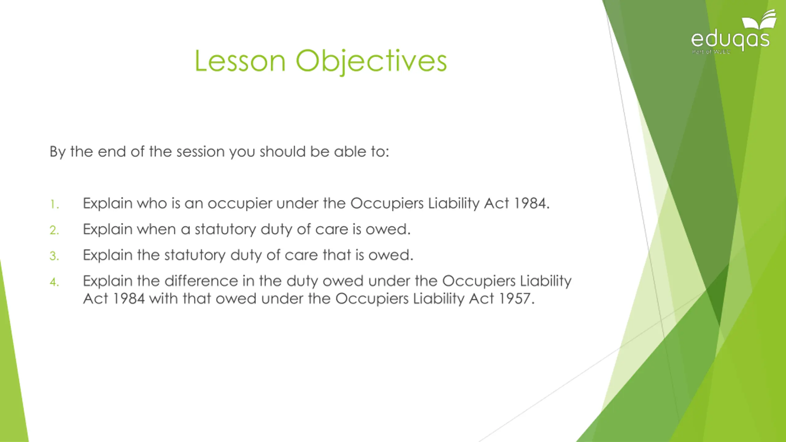 Lesson Objectives By the end of the session you should be able to: Explain who is an occupier under the Occupiers Liability Act 1984. 1. Explain when a statutory duty of care is owed. 2. Explain the statutory duty of care that is owed. 3. Explain the difference in the duty owed under the Occupiers Liability Act 1984 with that owed under the Occupiers Liability Act 1957. 4.