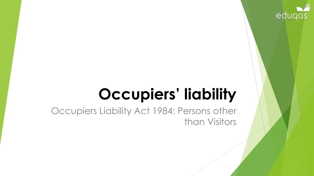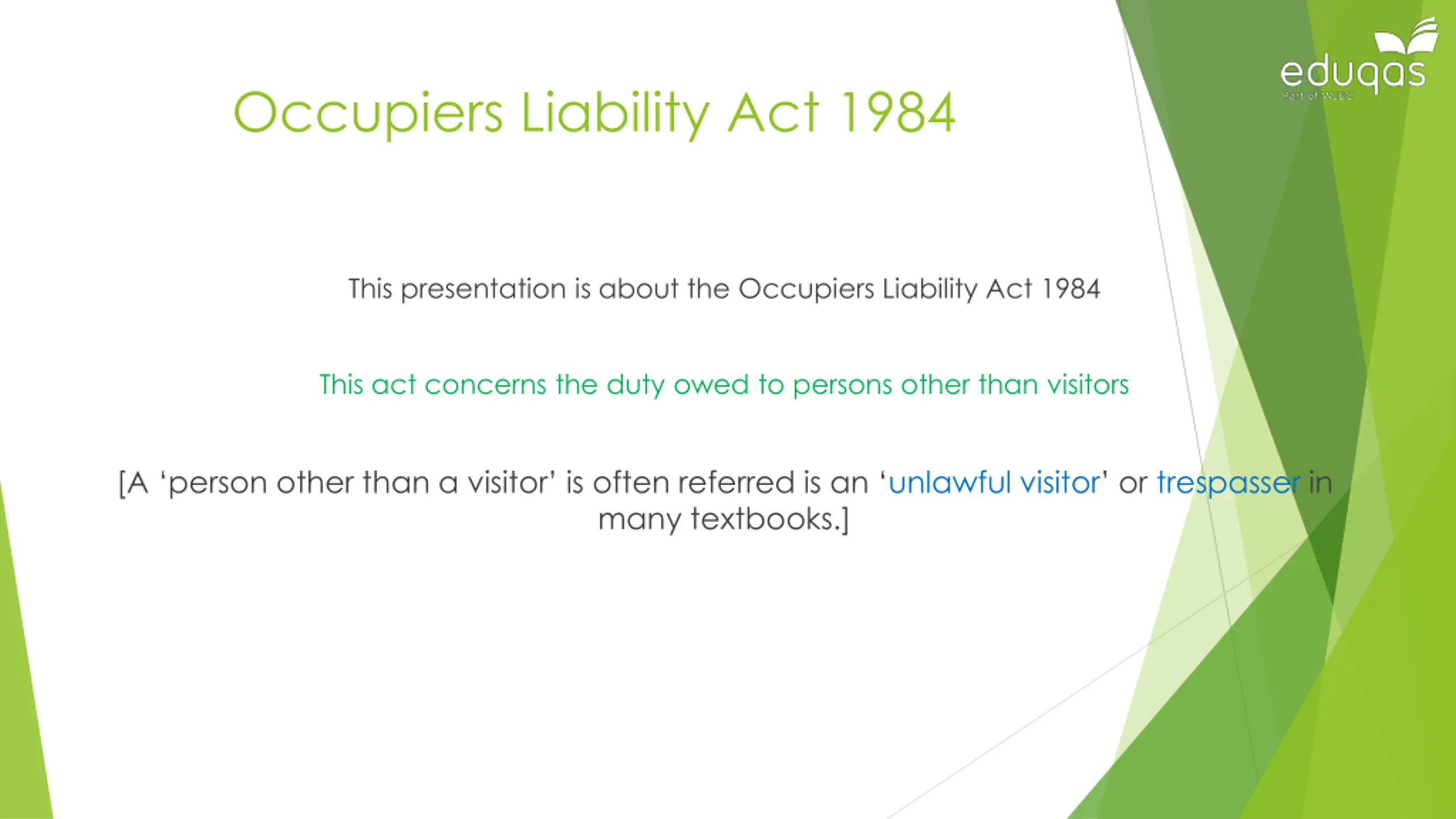 Occupiers Liability Act 1984 This presentation is about the Occupiers Liability Act 1984 This act concerns the duty owed to persons other than visitors [A person other than a visitor is often referred is an unlawful visitor or trespasser in many textbooks.]
